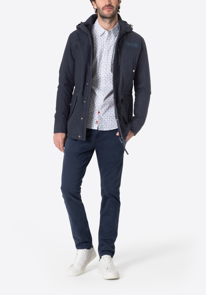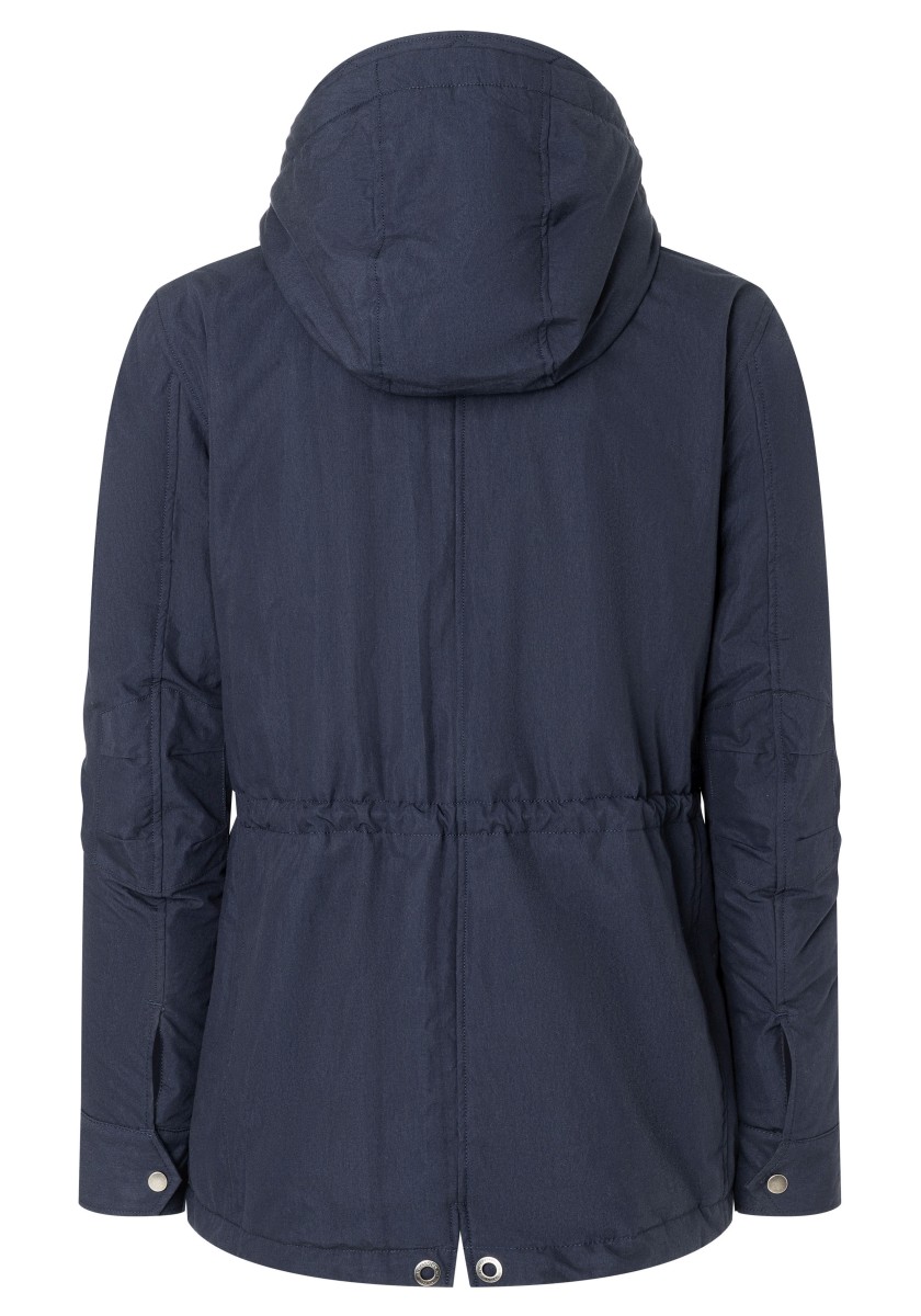 Perfect protection against cold and bad weather: Park made of high quality, water-repellent cotton-ninelon functional fabric. The park has a removable adjustable hood with a short peak, five practical outer and two other inner pockets, as well as a shaped sleeve cut with patches and cuffs. The lined and cotton jacket is fastened on a hidden and supported zipper with a fly on the press studs. The drawstring at the waist regulates the width.