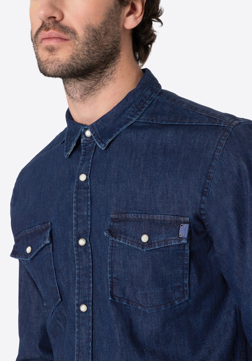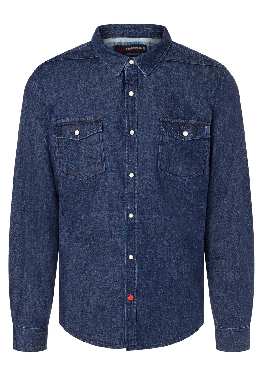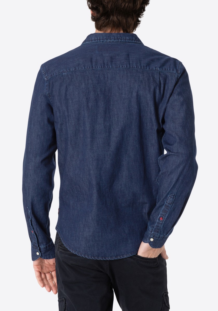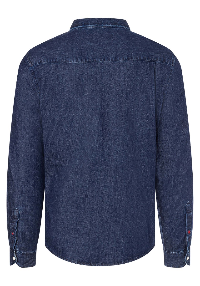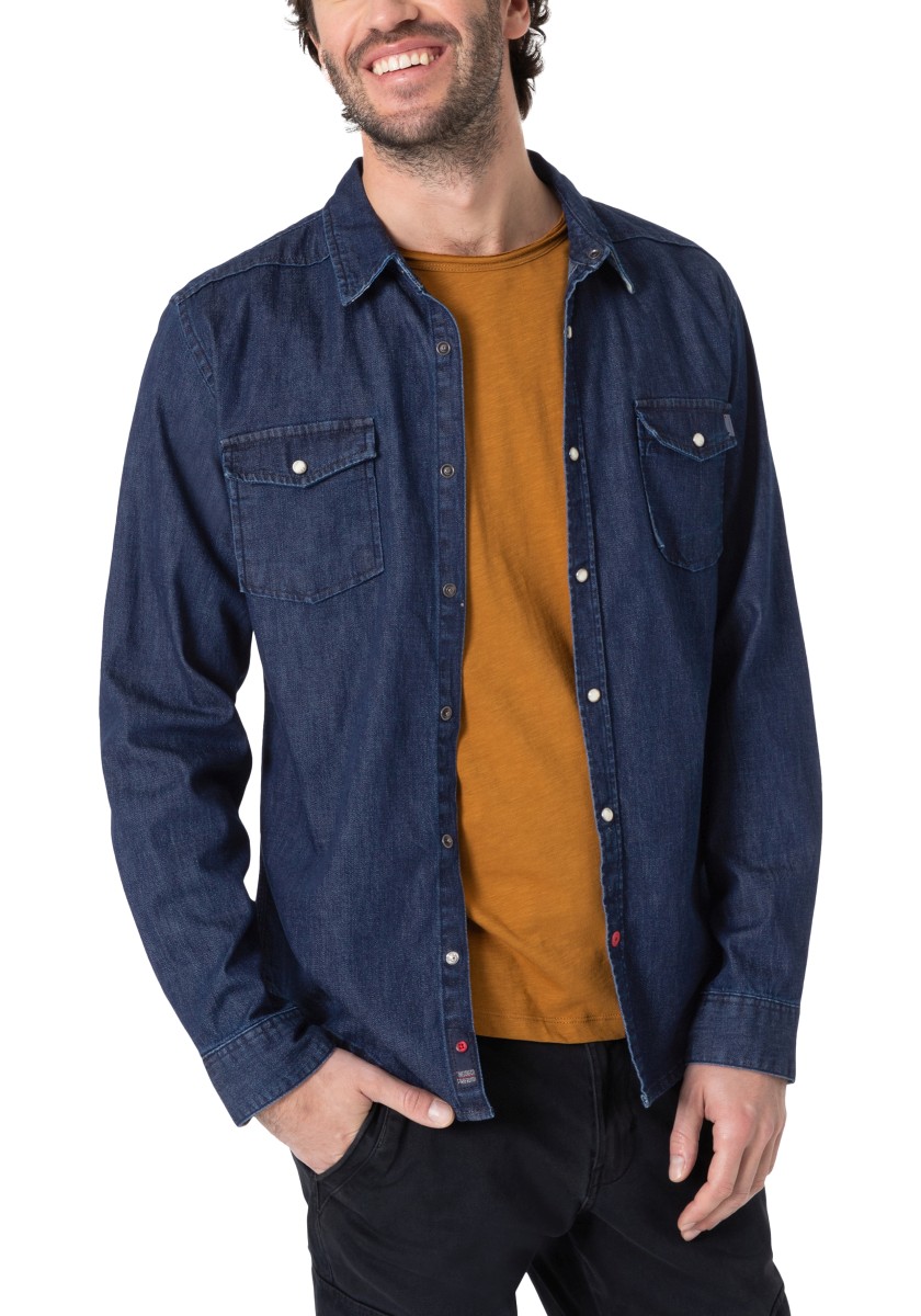 Without great stir: informal denim shirts of narrow cut requires no special treatment. He simply turned inside out and rinsed with cold water. This gives the cotton stretch model an authentic look while rinse. With Kent collar, patch pockets, patent fastening and rounded trim. The inner side of the rear collar, cuffs and the underside of the collar are decorated with trendy plaid pattern. Two folds on the back ensure freedom of movement.