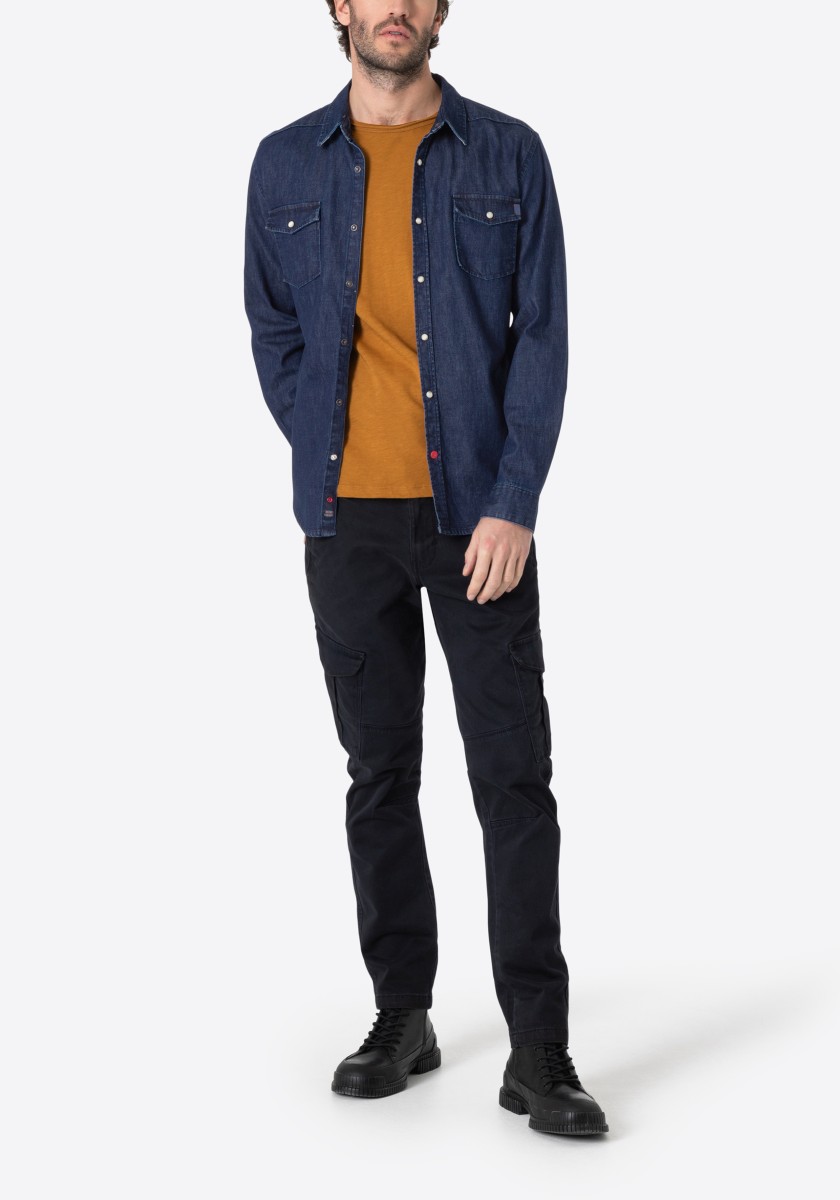 Bez velkého rozruchu: Neformální džínová košile úzkého střihu nevyžaduje žádné zvláštní zacházení. Jednoduše se po ušití obrátil naruby a opláchl studenou vodou. To dává bavlněnému strečovému modelu autentický vzhled při máchání. S límcem Kent, nášivkovými náprsními kapsami, zapínáním na patentky a zaobleným lemem. Vnitřní strana zadního límce, manžety a spodní strana límce jsou zdobeny trendy kostkovaným vzorem. Dva záhyby na zádech zajišťují volnost pohybu.