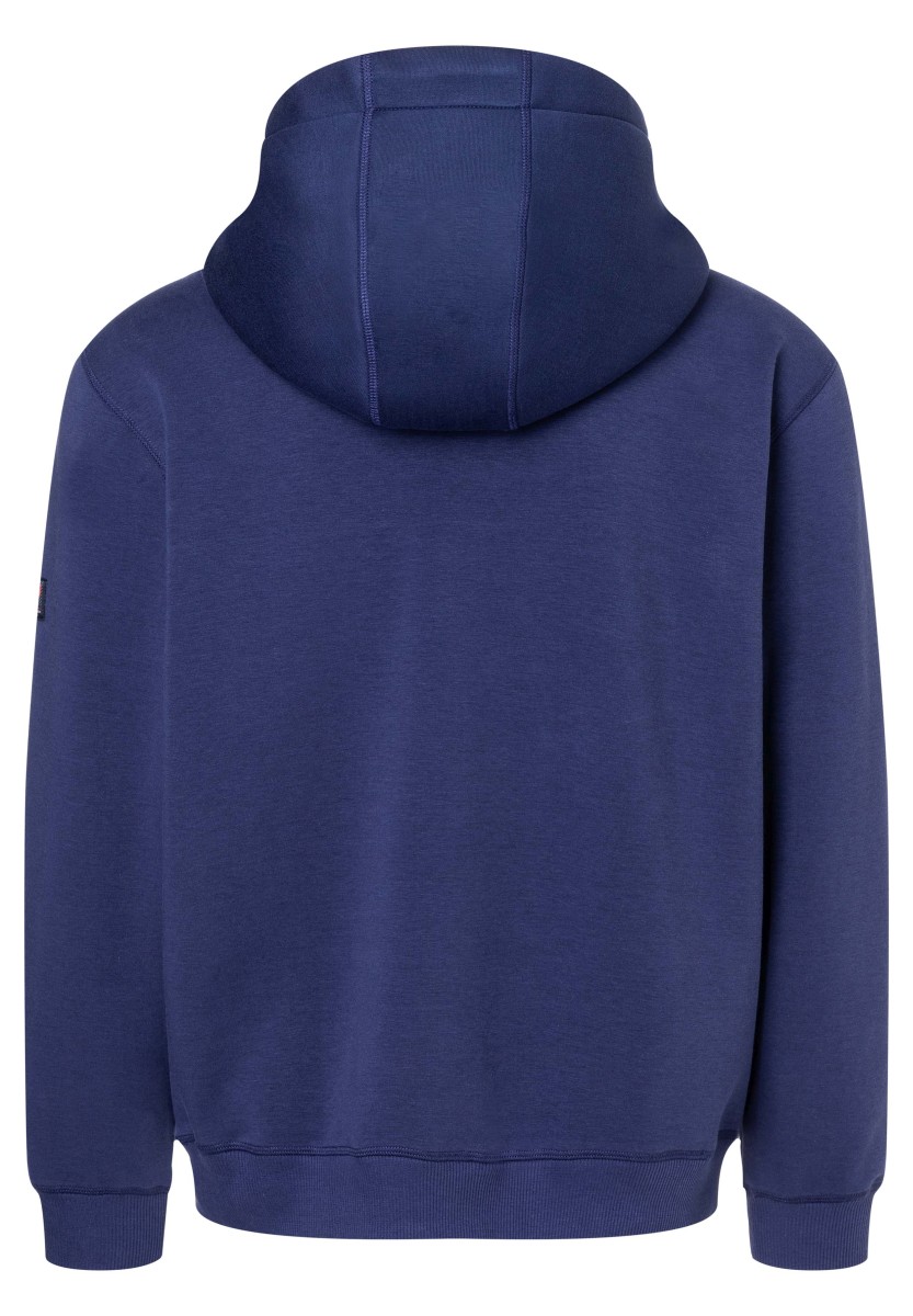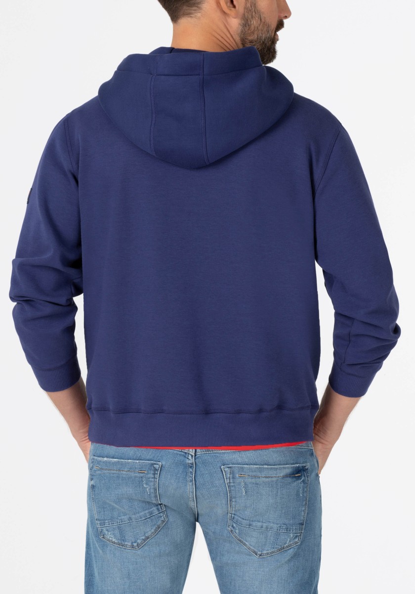 An enduring trend with casual athletic roots: the hoodie. Quality: compact, new, technical and elastic interlock fabric made of a high-quality cotton-viscose blend. Cut: loose, comfortable, sporty. Features: large hood with front overlap, metal eyelets with XL logo and round drawstring with silicone ends in contrast colour, ribbed cuffs and hem and split chest seam. Cut: with pre-cut side seams and kangaroo pocket.