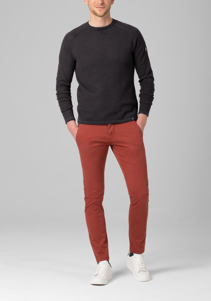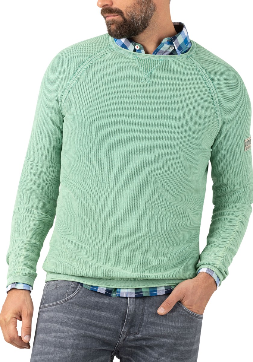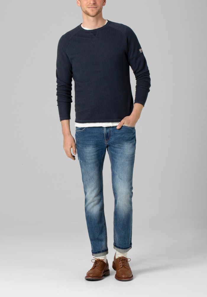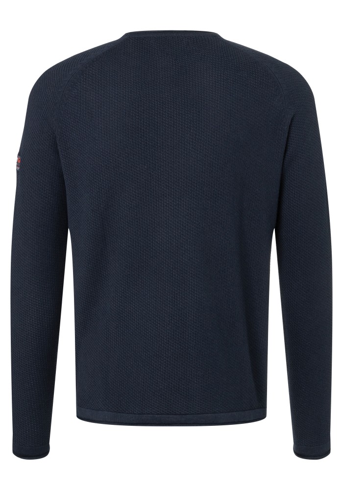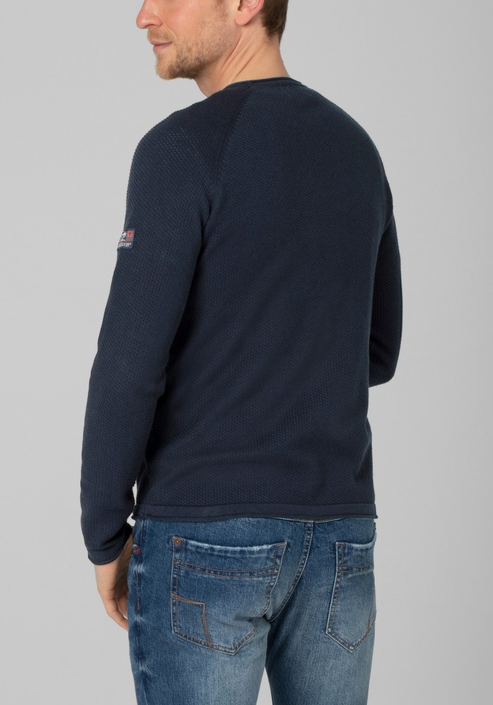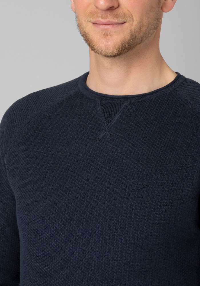 If there is a basic piece that should not be missing in the wardrobe, then it is a cleanly designed, summery knit sweater for every occasion. Perfect for this: the model made of pure cotton with a casual rice grain structure. Classic regular fit with sporty raglan sleeves and a comfortable fit. The sweater comes with rolled edges at the round neckline, the cuffs and the hem. Inspired by the sweatshirt: the triangle detail on the front neckline.