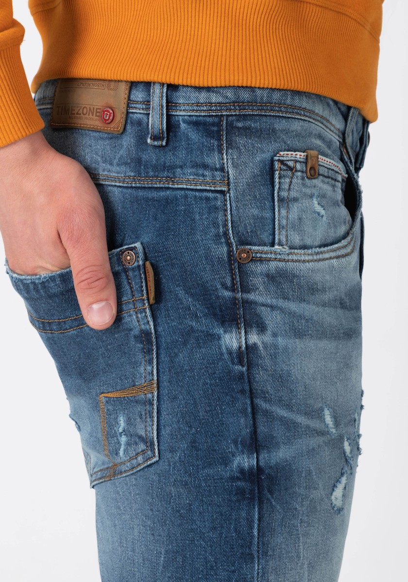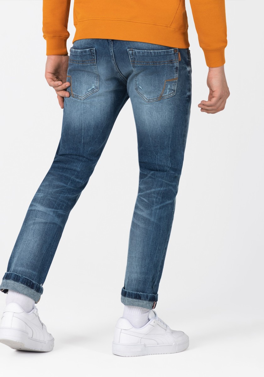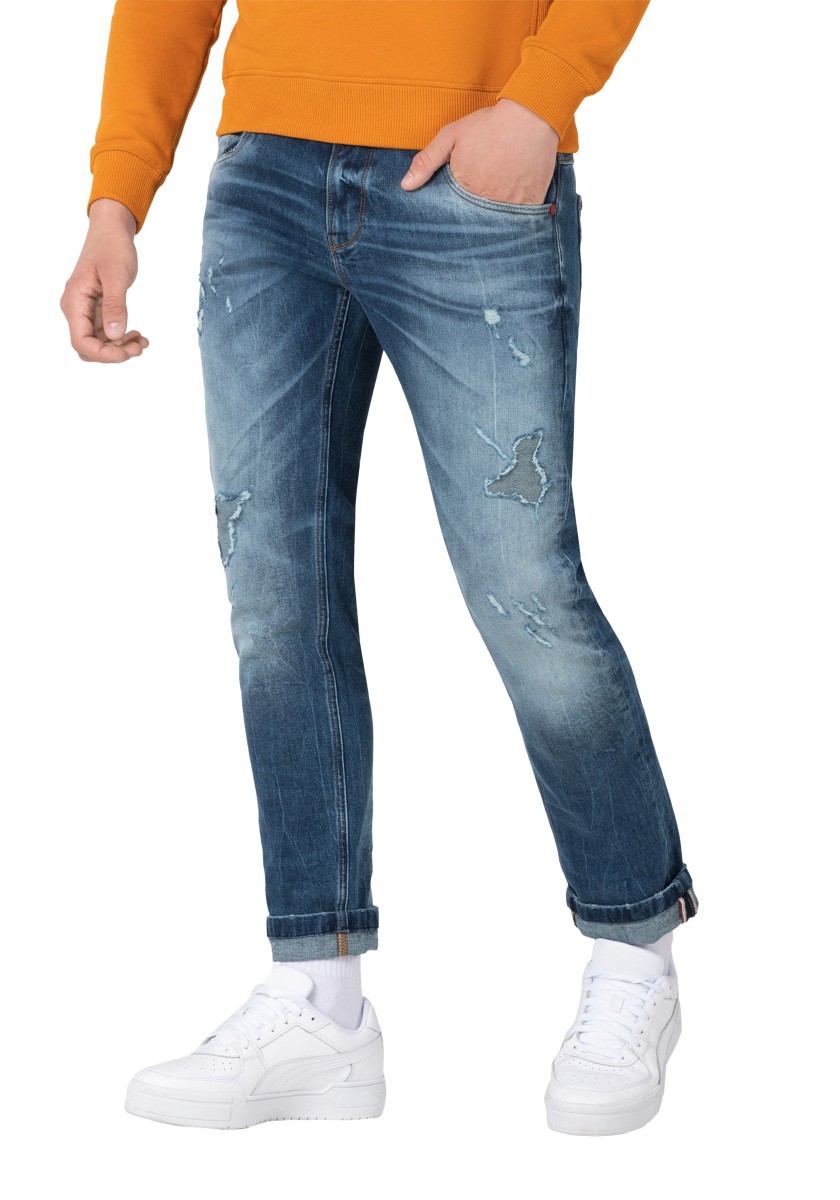 One of the most popular jeans cuts: the slim fit. In addition to the perfect fit with a medium waist and X-slim legs, this model also offers the perfect used look with super cool destroy and repair details. Authentic, rough with extreme areas of abrasion and incorporated seat folds. The quality: A robust, dry denim made from a cotton mix with elastane. Cool: The selvedge detail on the rolled side seam. Five pocket style with genuine leather details. We Love!