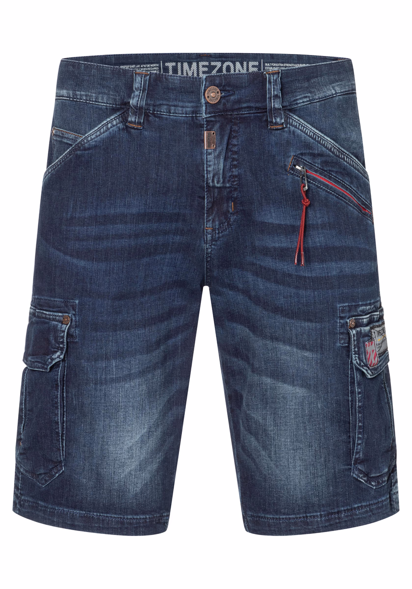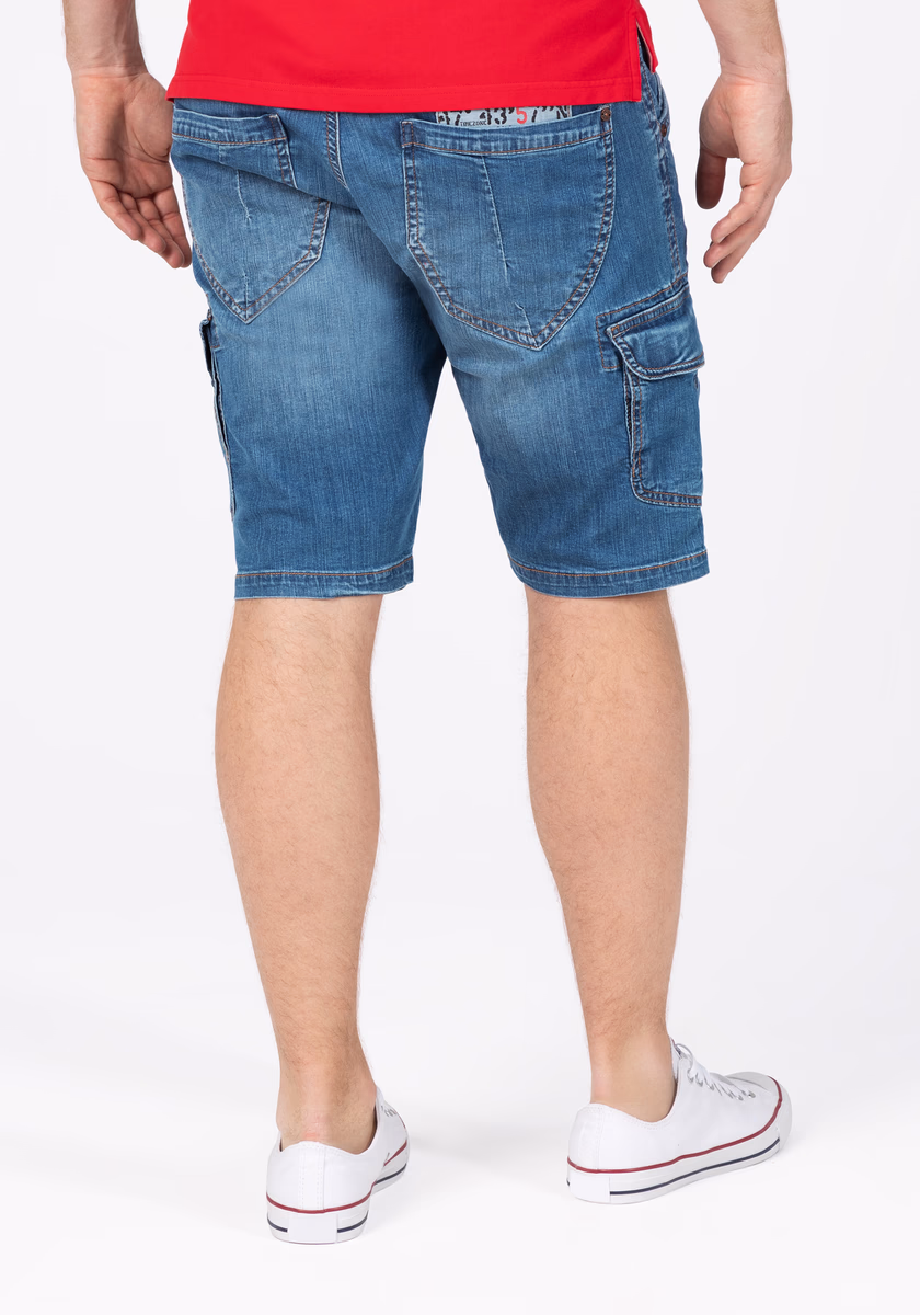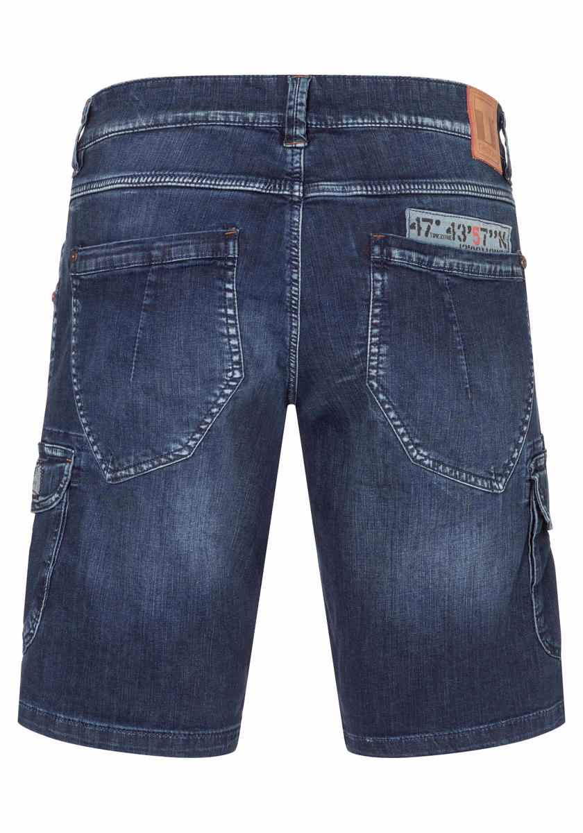 These casual cargo jeans shorts are made of durable and light indigo denim and have a regular cut with medium stature and slim short leg. Pants have engaging finishing details, distinctive quilted seams and numerous pockets for everyday necessity. It is worth mentioning: sophisticated patches with logo, real leather details and other zippered pocket. Wasted look with fine traces of abrasion and permanent folds of sitting.