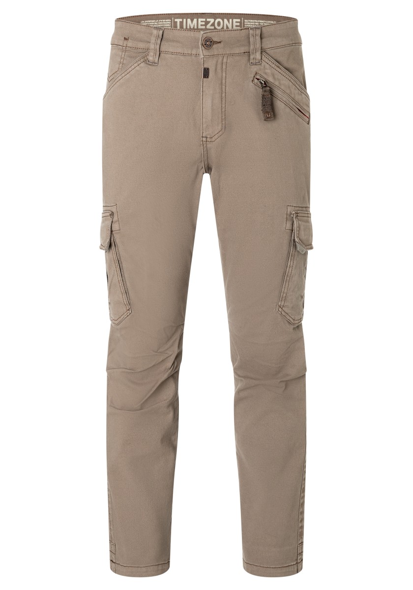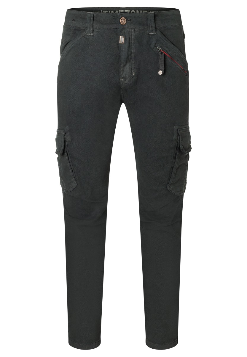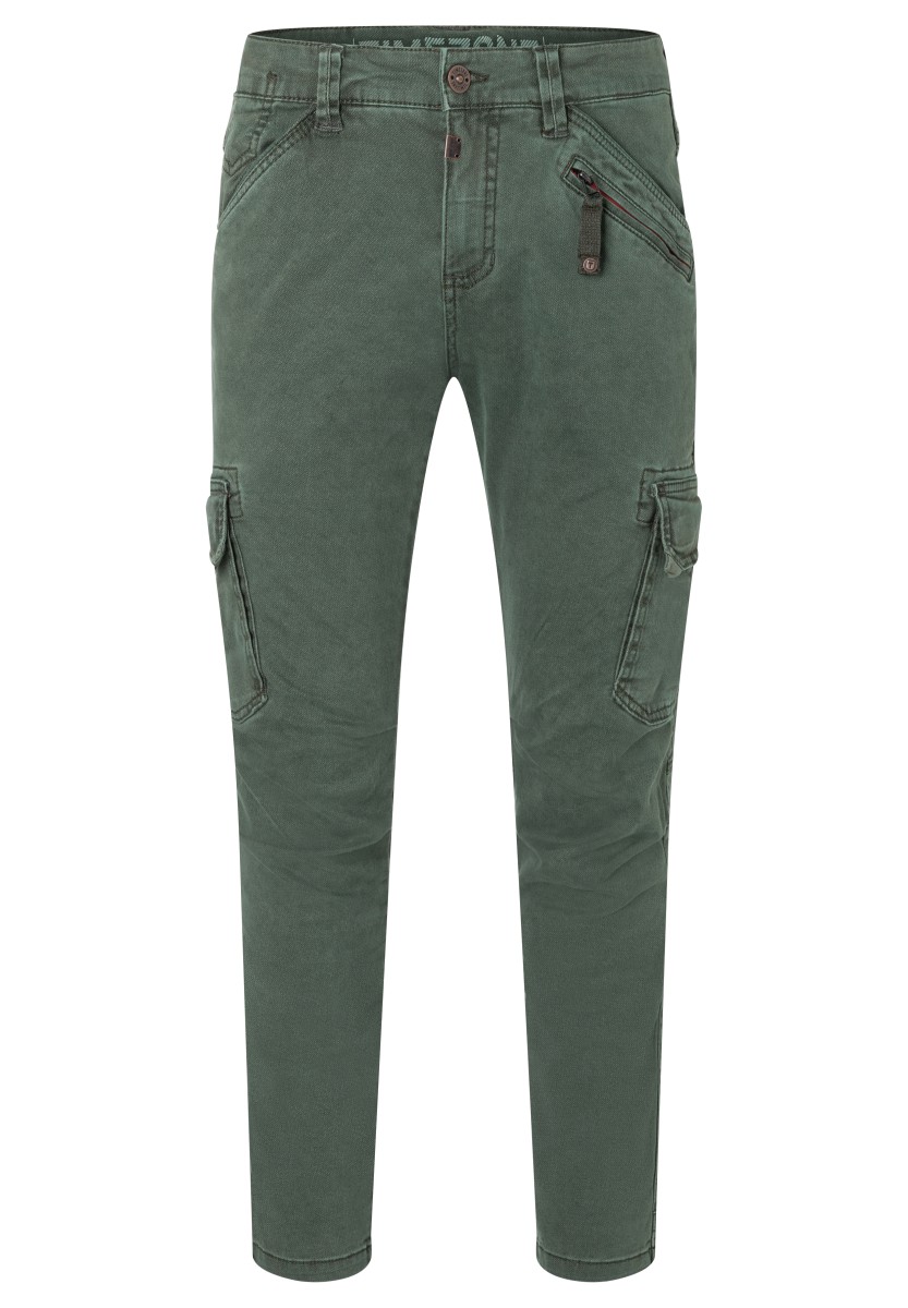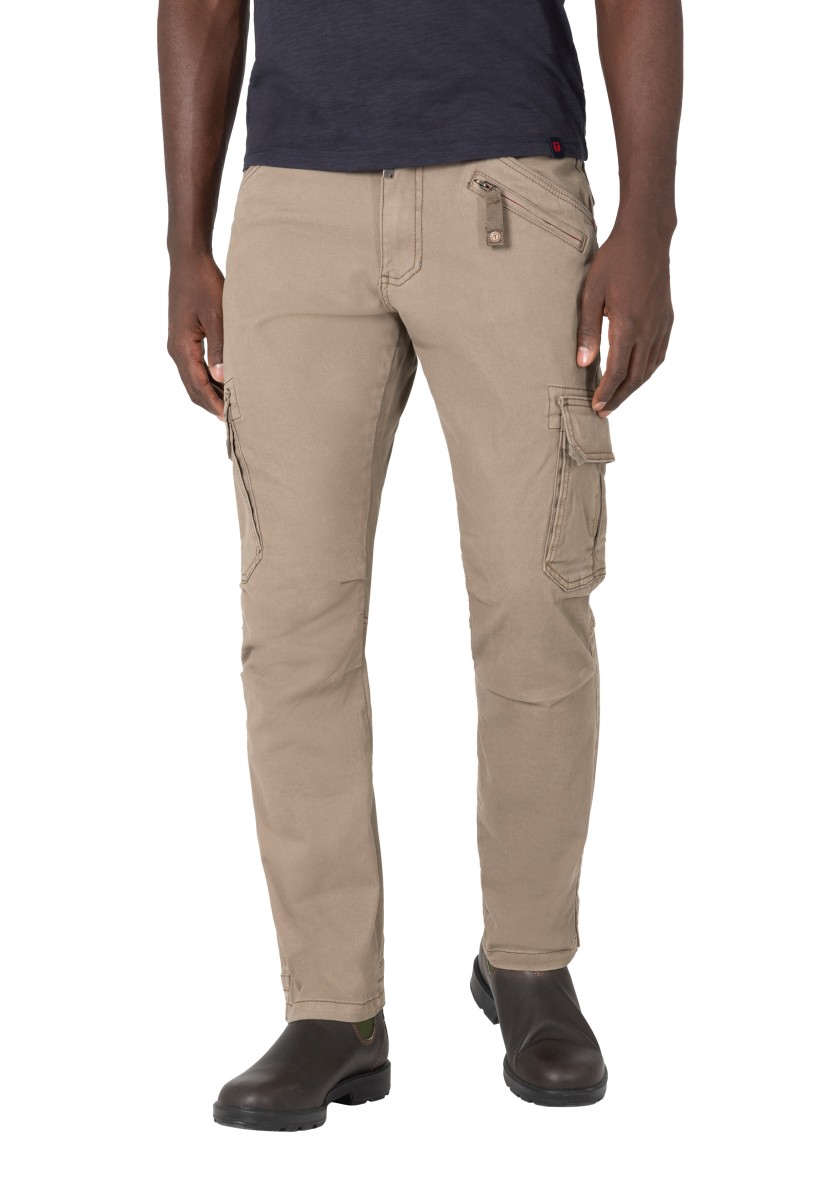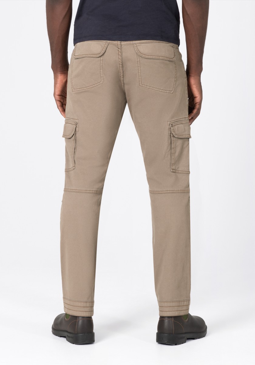 Inspired by workwear and redesigned for everyday use: cargo pants. This model is made from a stretchy, robust and peached Dobby quality in a washed cotton mix. With tough workmanship details, striking stitching and a sophisticated, slightly pre-shaped knee section. Practical and characteristic: Two slanted side pockets with a coin pocket, a zipper pocket, two cargo flap pockets on the sides and two quilted flap pockets on the back.