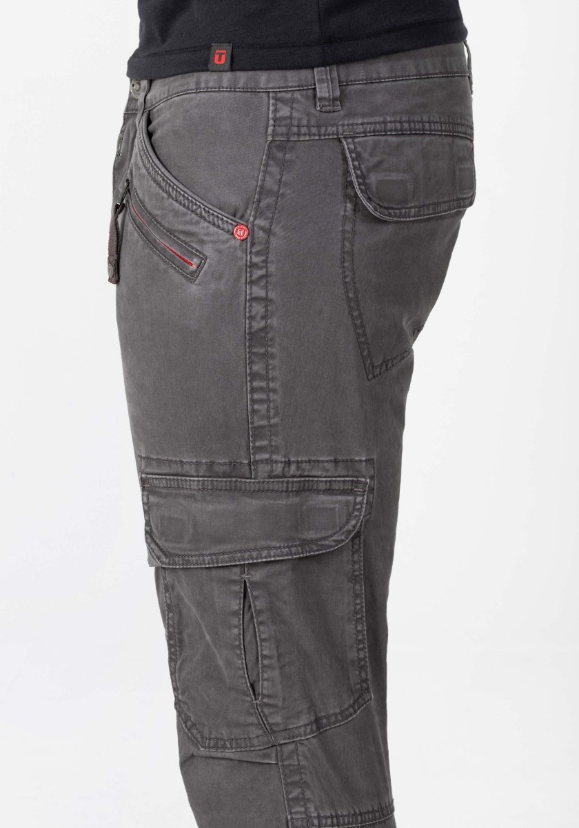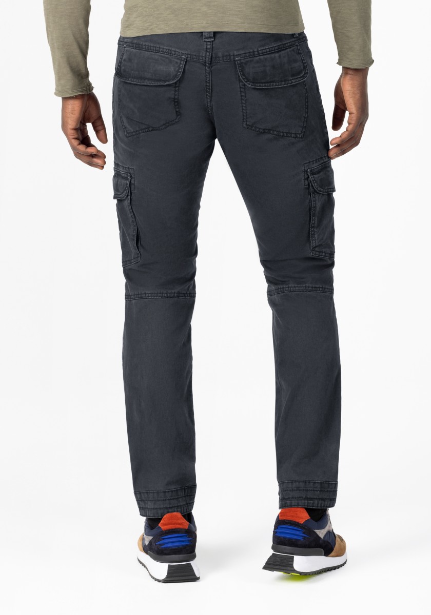 Cargo trousers inspired by workwear and redesigned for everyday wear. This model is made from stretchy, strong and smooth twill in a washed cotton blend. With thoughtful workmanship details, distinctive stitching and a worked, slightly pre-shaped knee. Practical and characteristic features: two slanted pockets with coin pocket, one zipped pocket, two cargo pockets with flap on the sides and two flap pockets on the back.