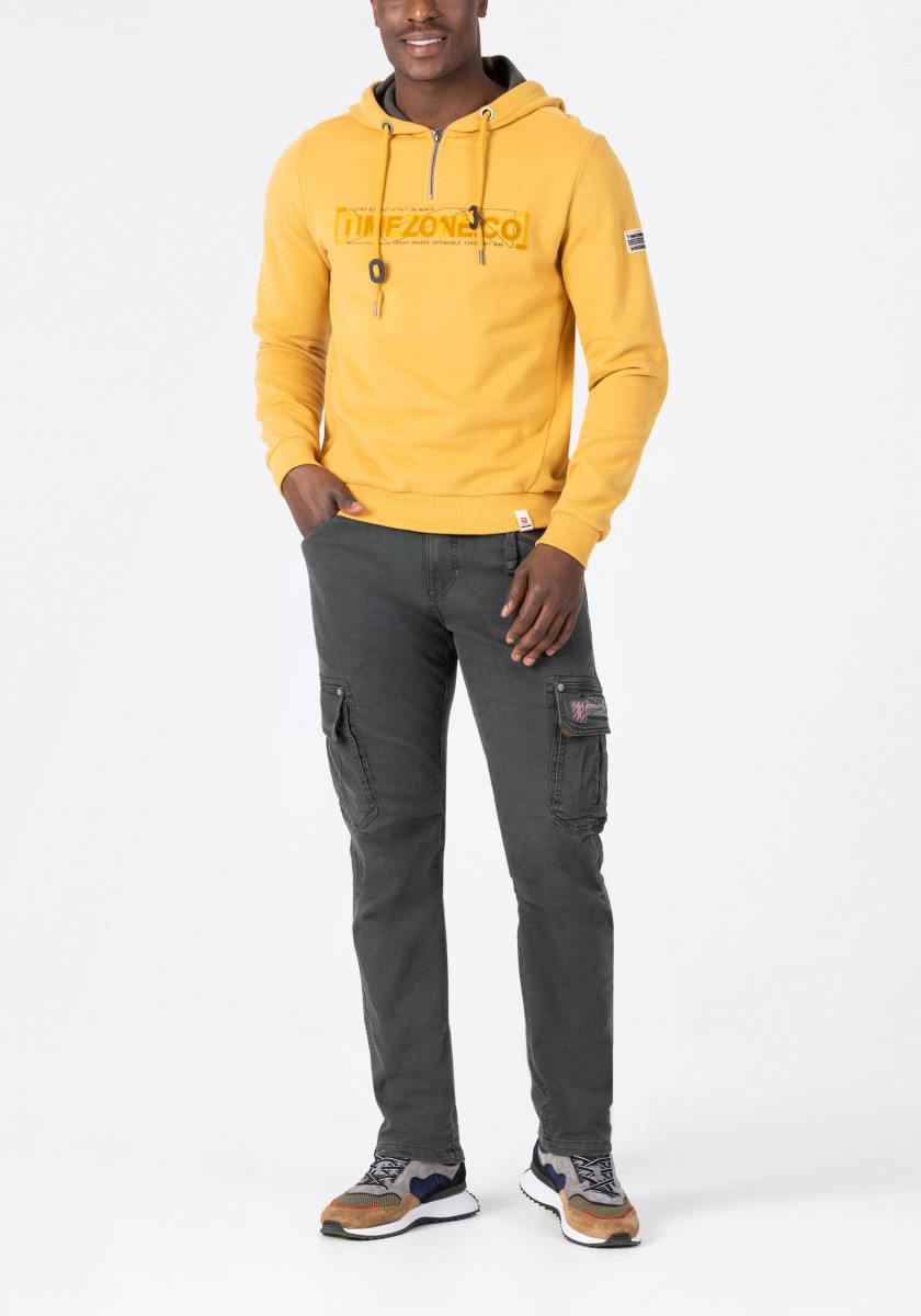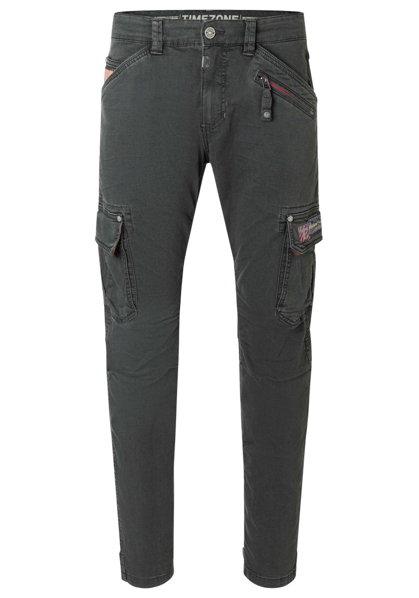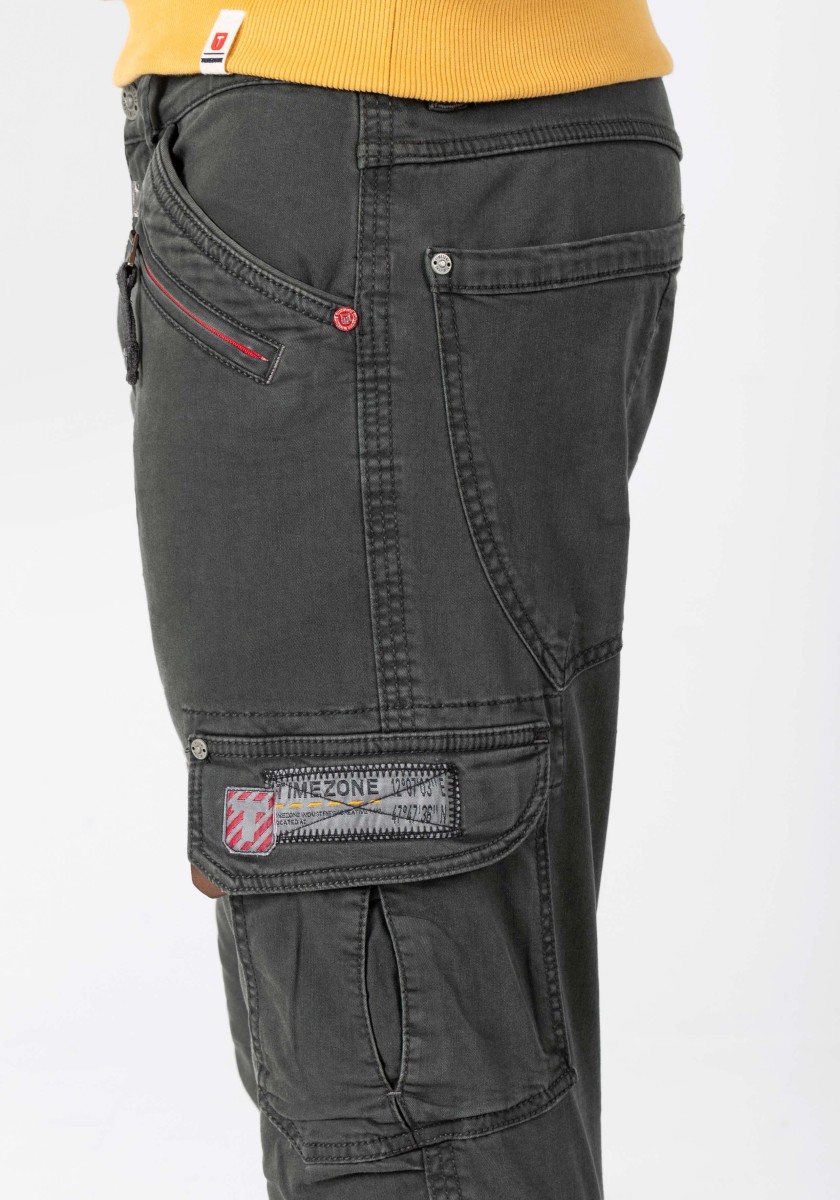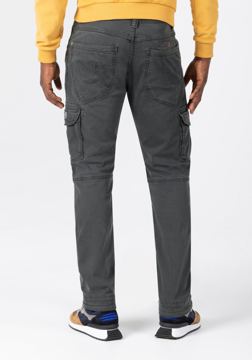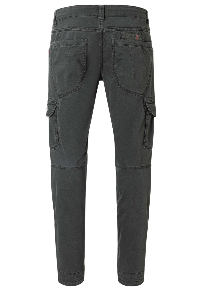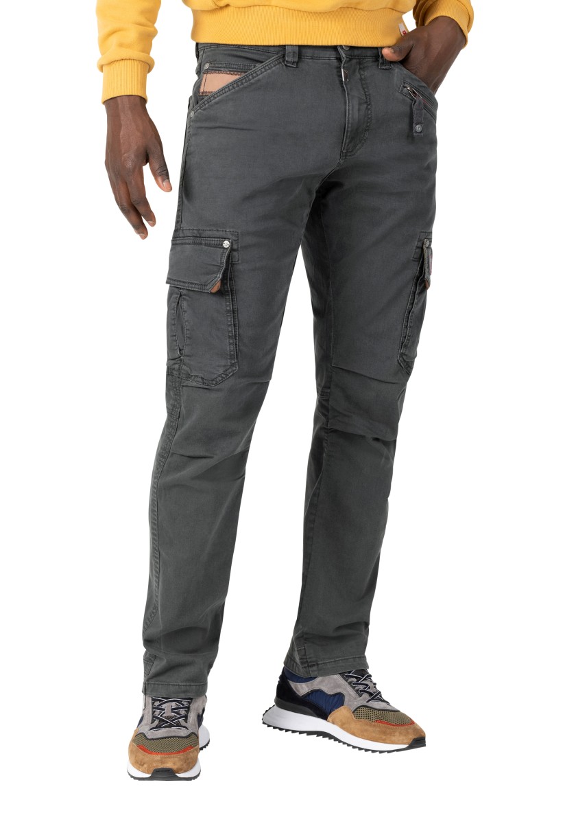 Cargo kalhoty jsou již léta nedílnou součástí pánské módy. Tento model je vyroben z pružné, pevné a zároveň lehké džínoviny ve směsi bavlny a viskózy. S promyšlenými detaily zpracování, výrazným prošíváním, propracovanou, mírně předtvarovanou oblastí kolen a četnými kapsami: dvě šikmé kapsy s kapsičkou na mince, jedna kapsa na zip, dvě kapsy s klopou na bocích a dvě velké našité kapsy na zadní straně.