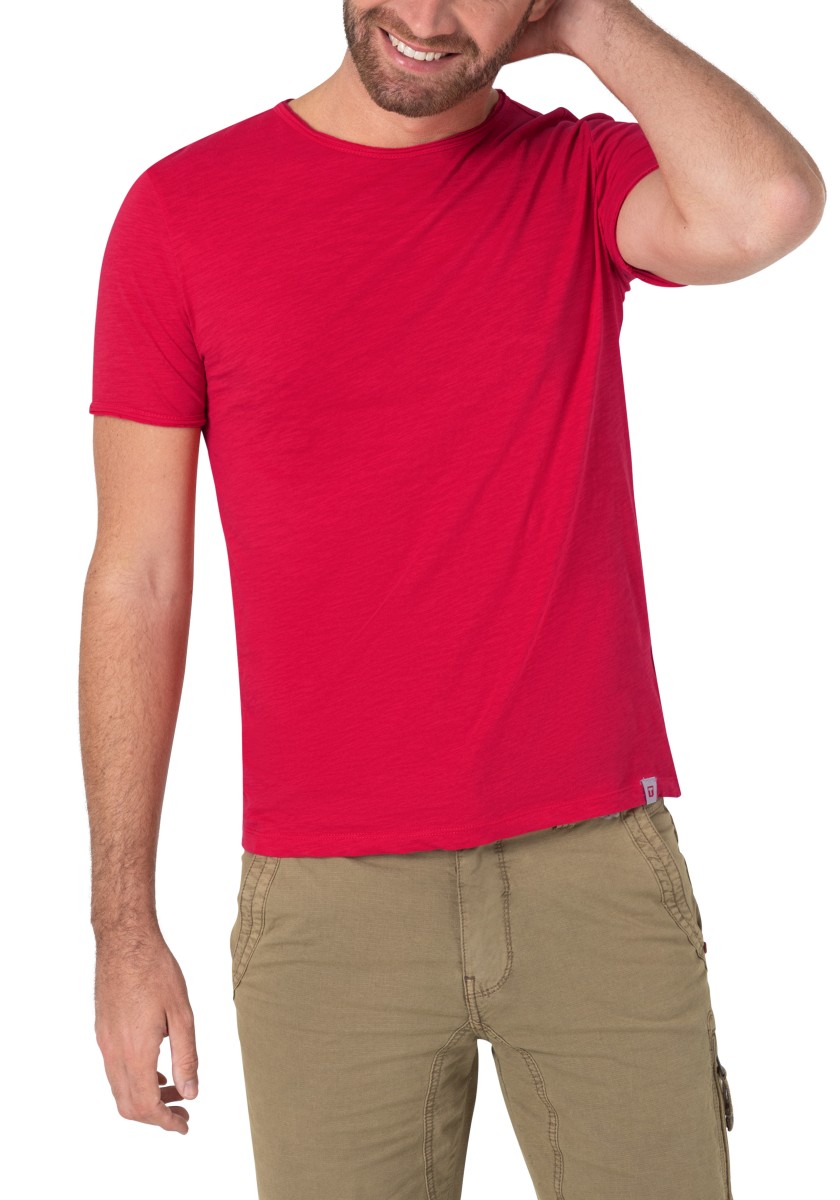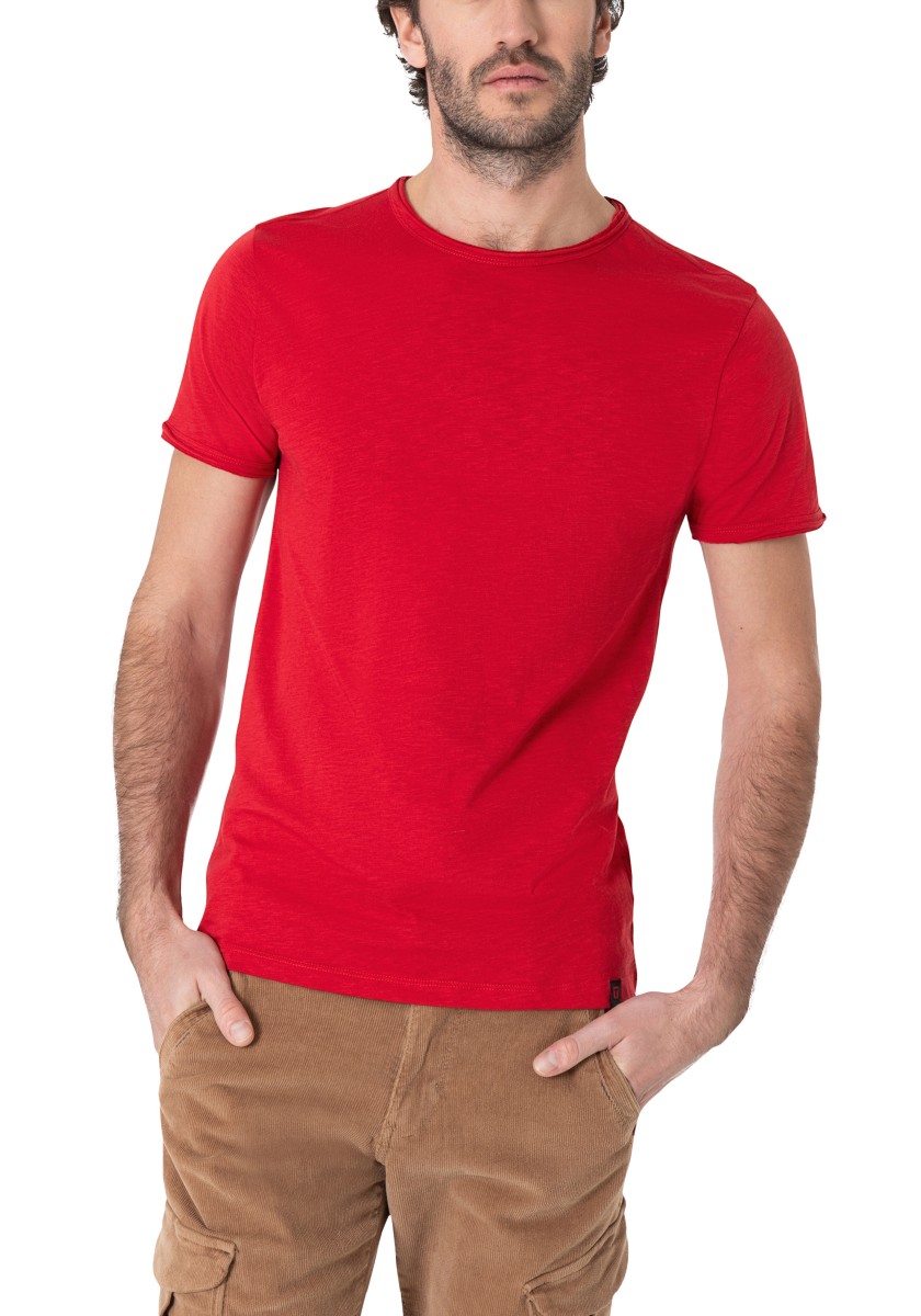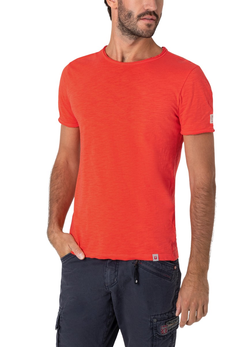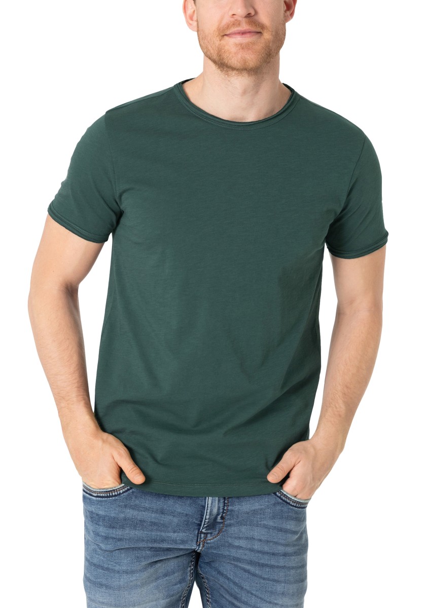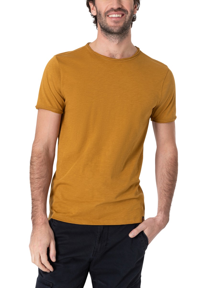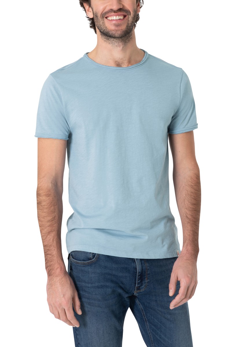 Clean T -shirt design with casual cut and rolled edges on the neck and cuffs. Quality: Soft jersey fabric made of high quality clean cotton. It is characterized by an irregular, living surface, which is the result of deliberate thickening of the yarn. Pleasant: Fine print on the neck is replaced by a annoying woven label. Available in a wide range of colors.