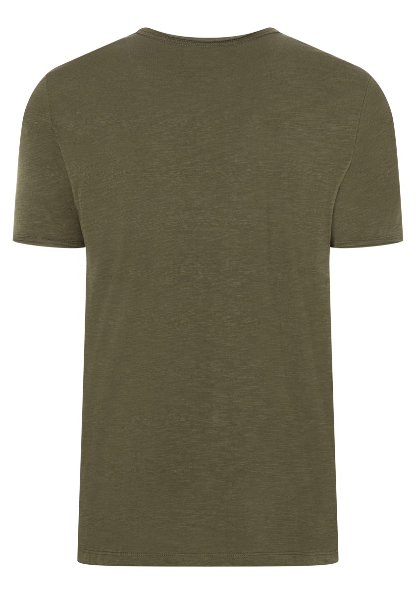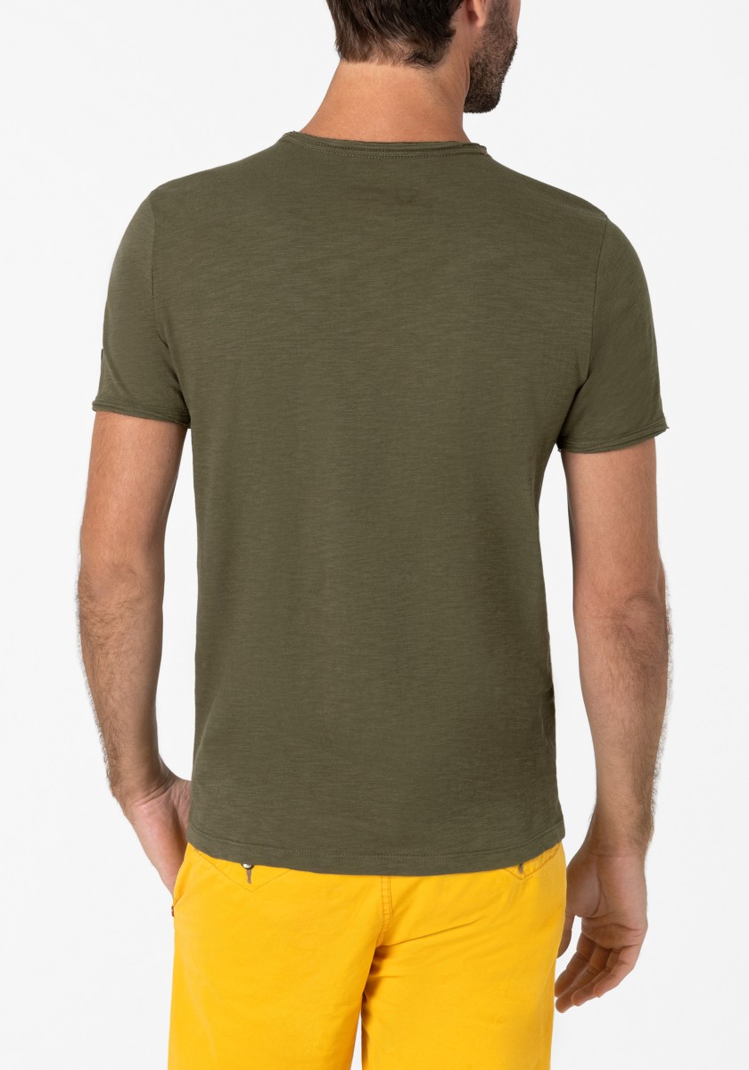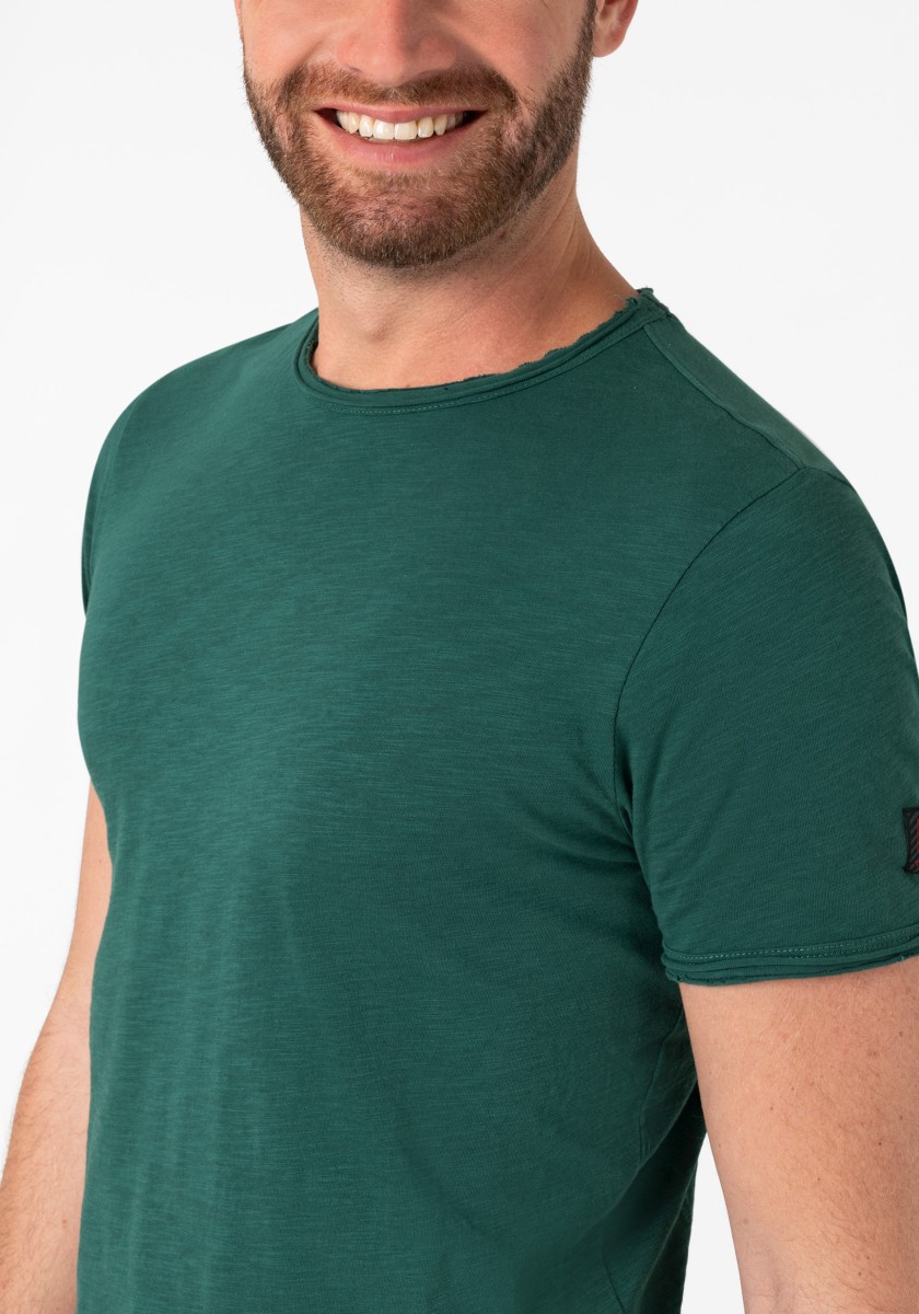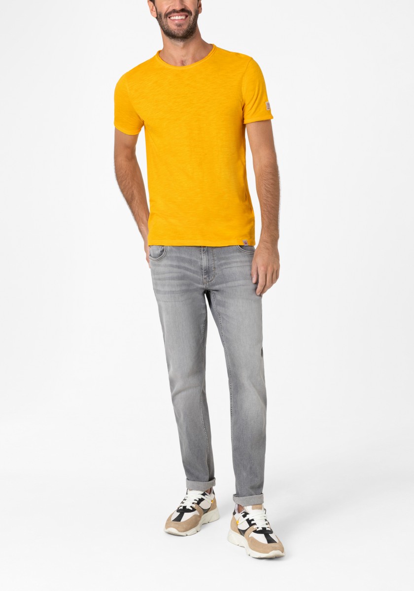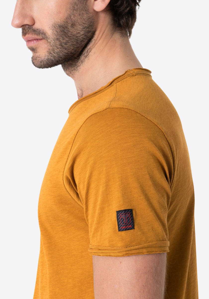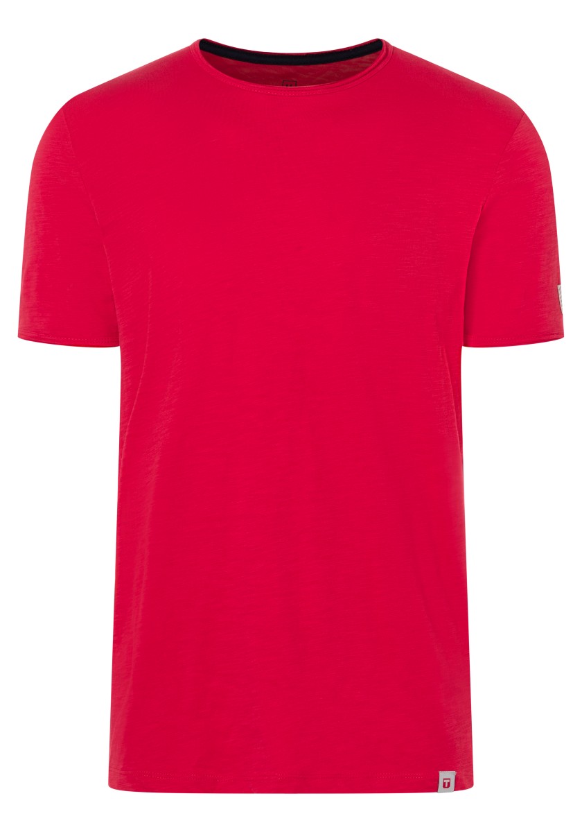 Clean T -shirt design with casual cut and rolled edges on the neck and cuffs. Quality: Soft jersey fabric made of high quality clean cotton. It is characterized by an irregular, living surface, which is the result of deliberate thickening of the yarn. Pleasant: Fine print on the neck is replaced by a annoying woven label. Available in a wide range of colors.