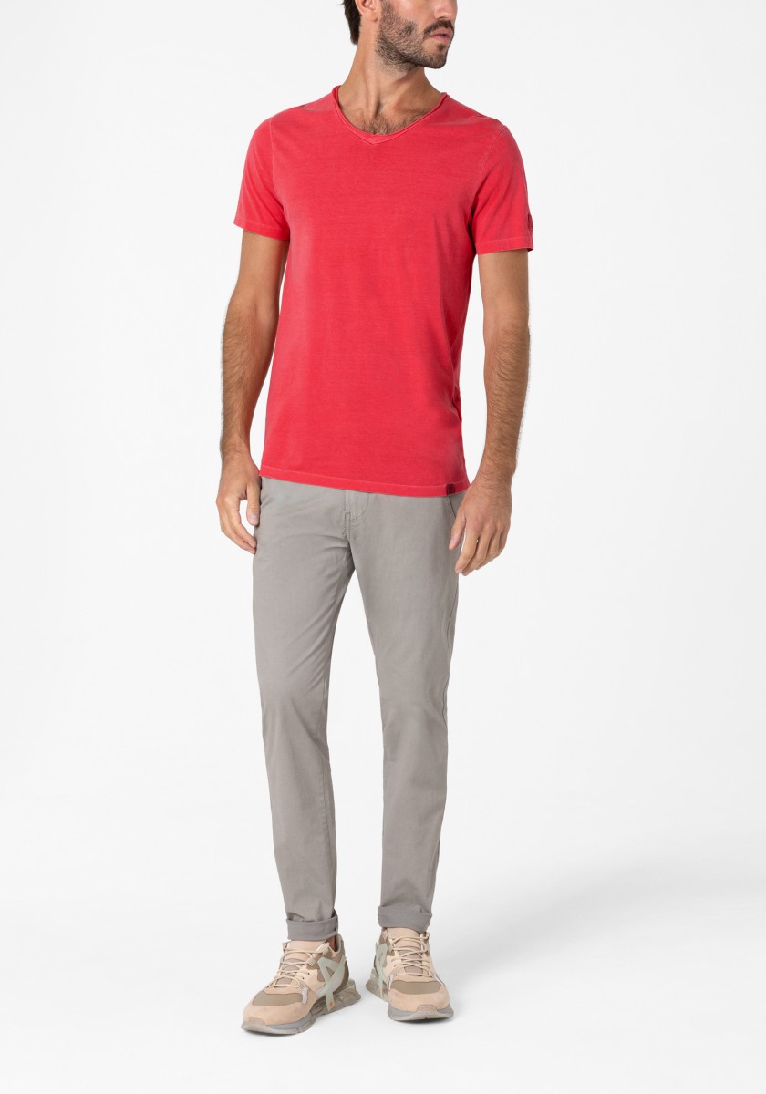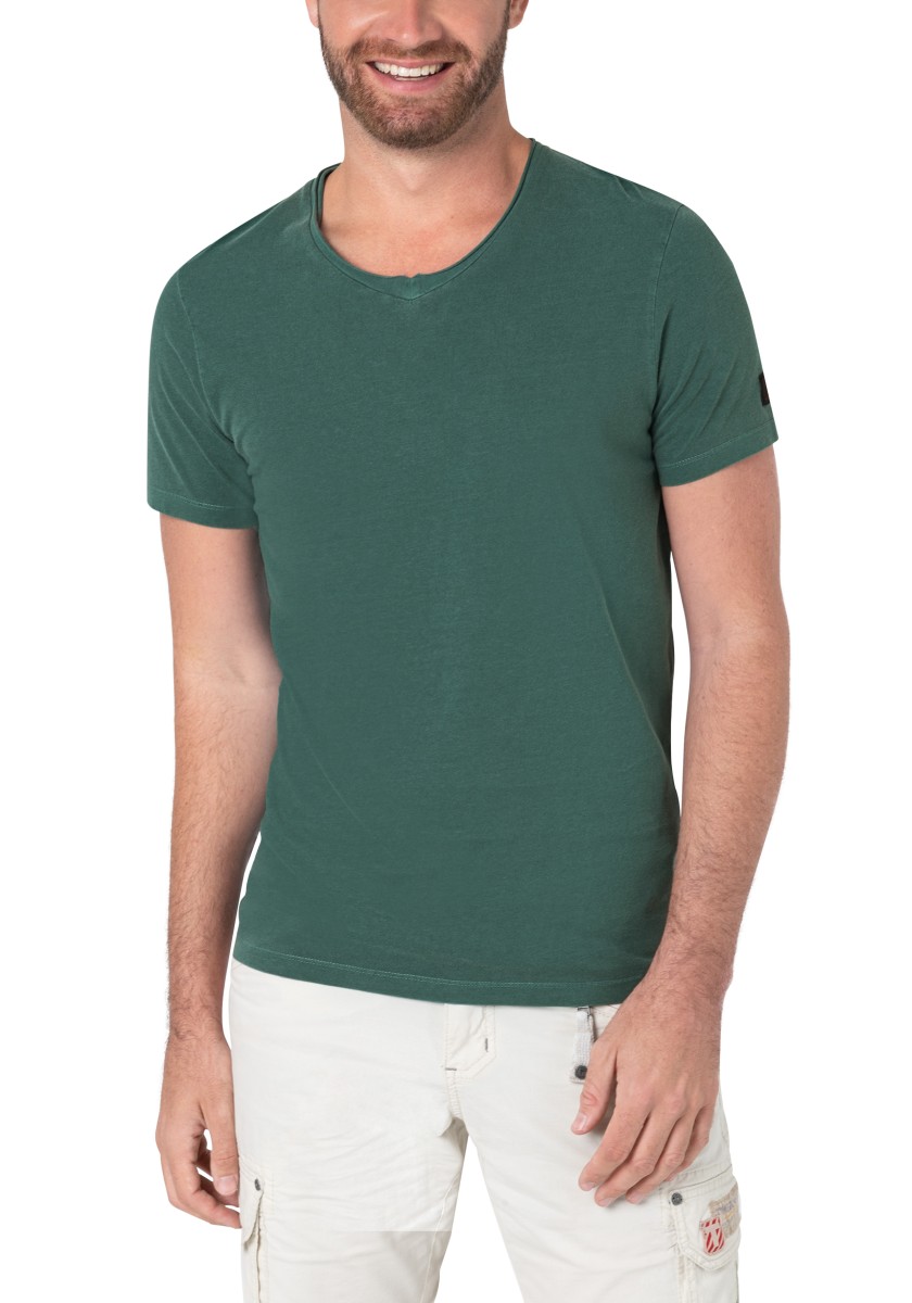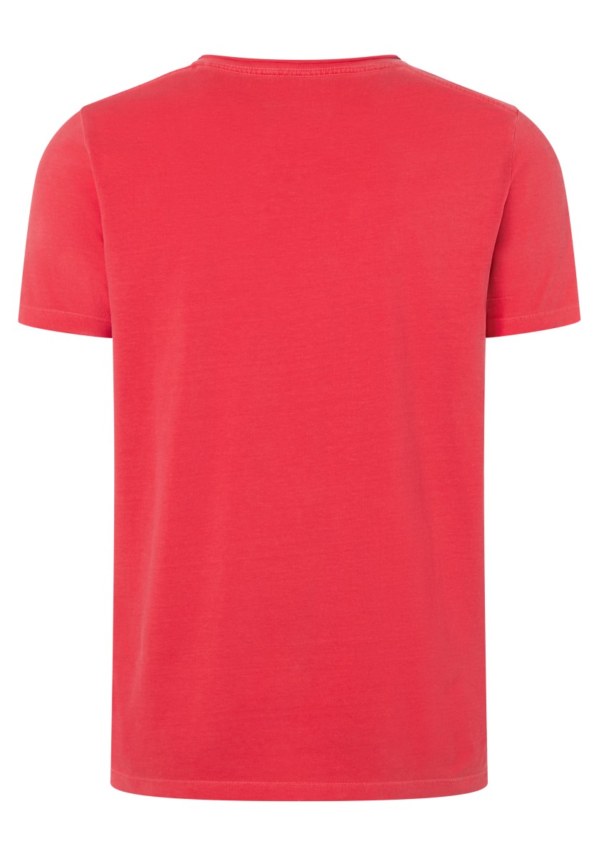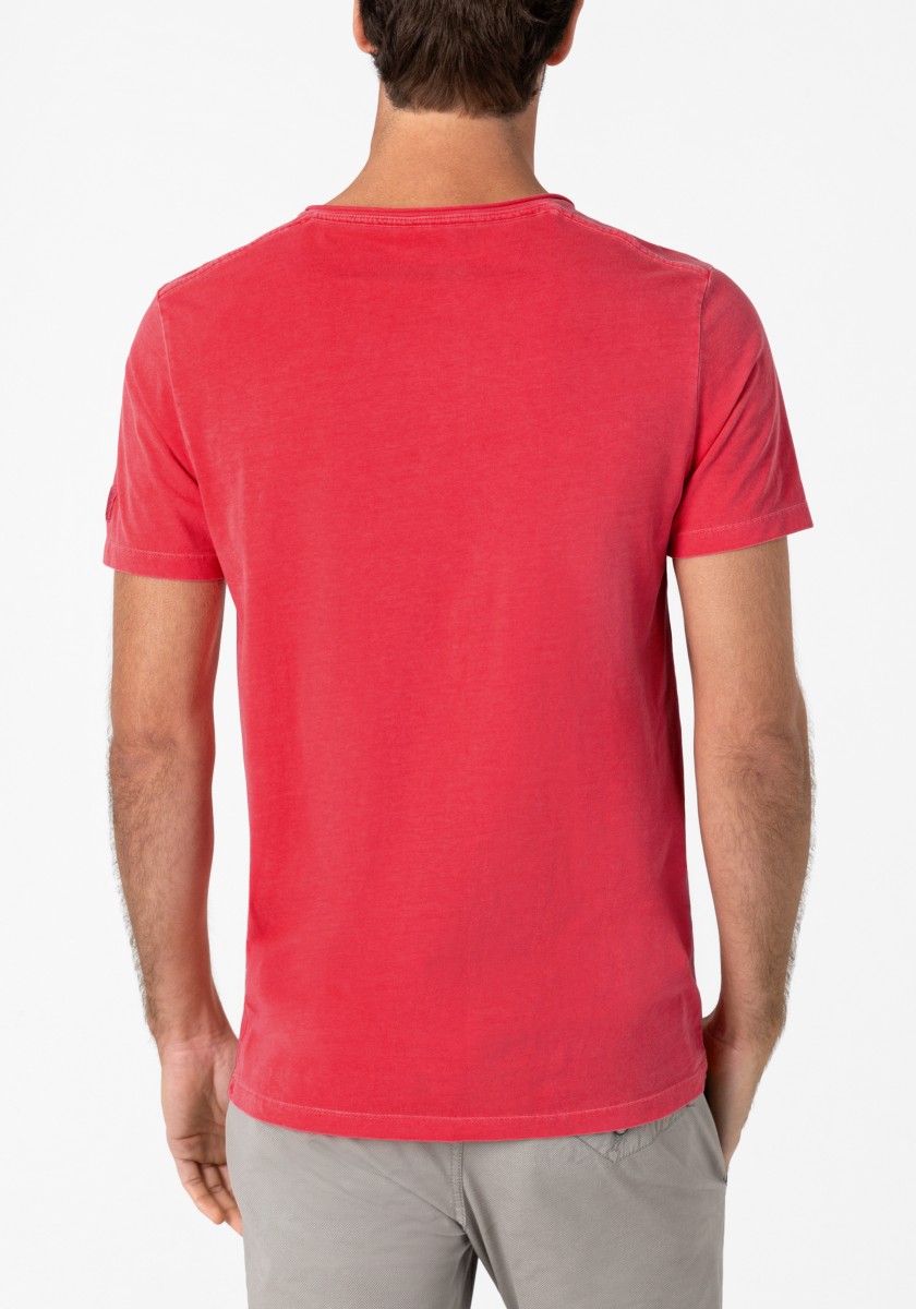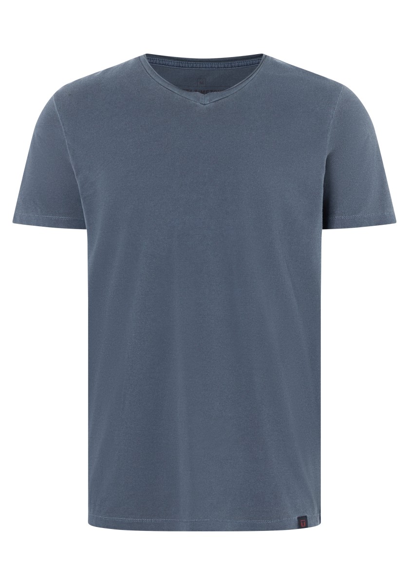Clean, simple design T -shirts with casual cut and rolled up V -neck. The end of the sleeves and hem are classically ending with a double seam. Quality: Soft single jersey fabric made of pure, high quality cotton. What is strange: deliberate color irregularities are caused by the process of dyeing clothes. Comfortable: Soft print on the neck instead of annoying woven label. Available in many summer colors.