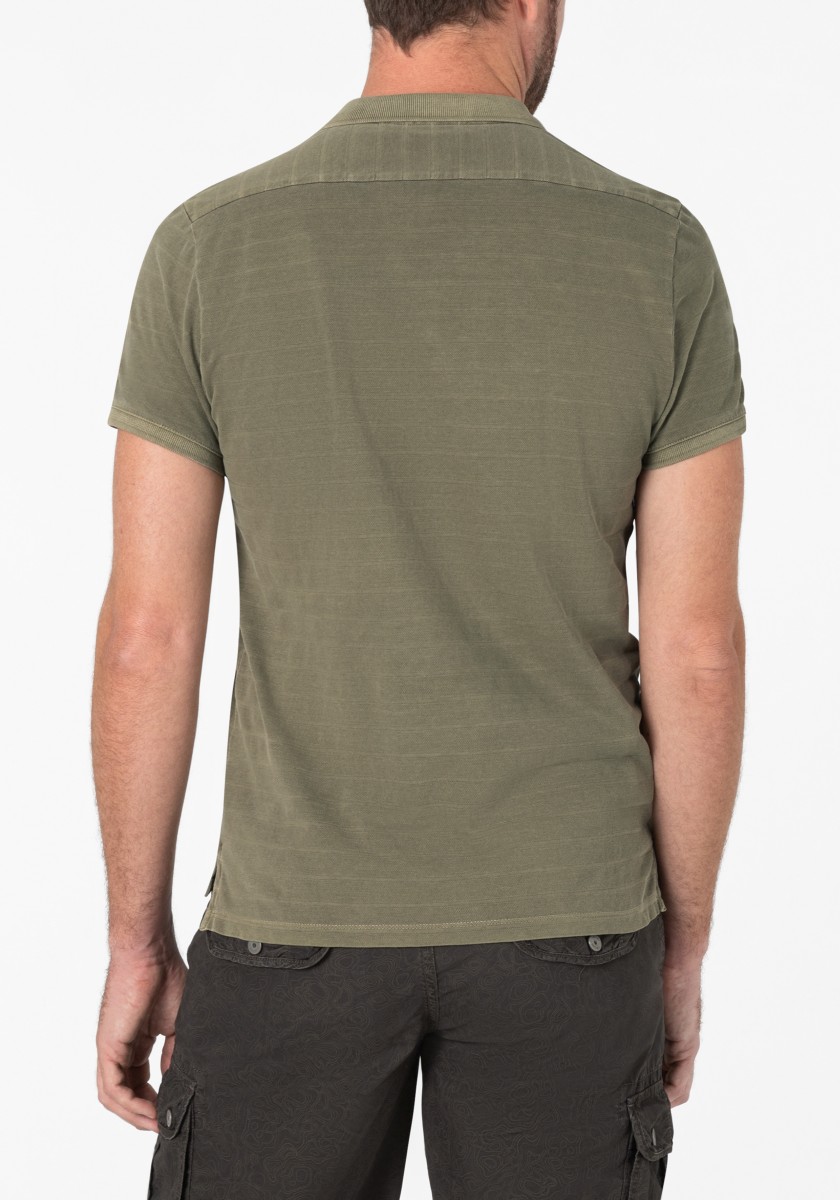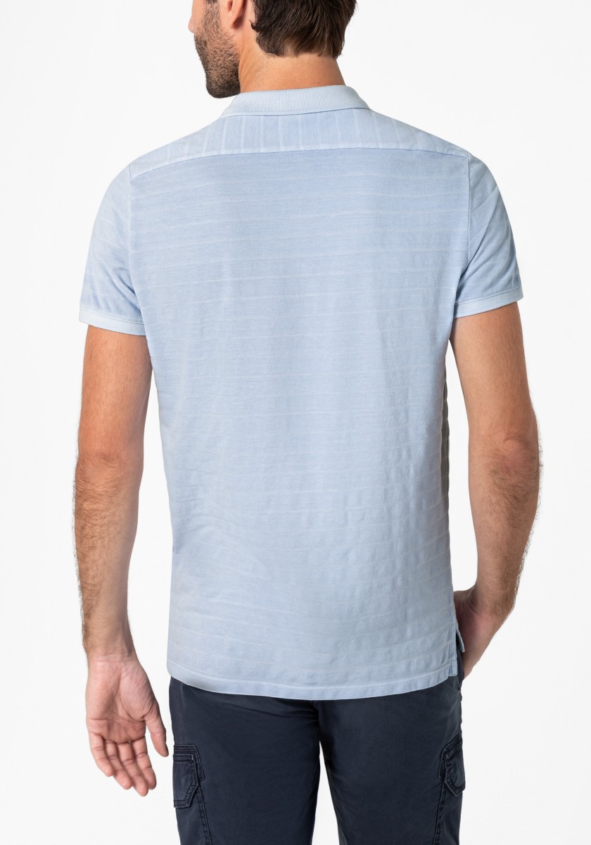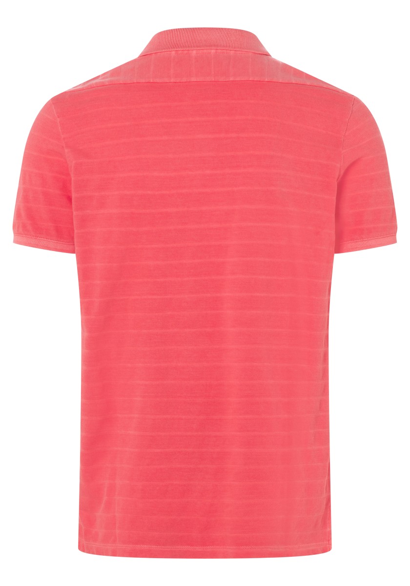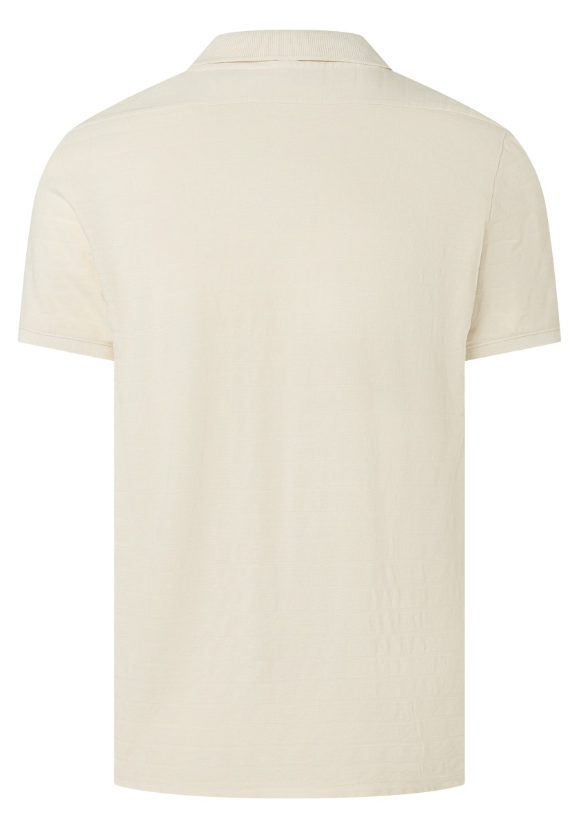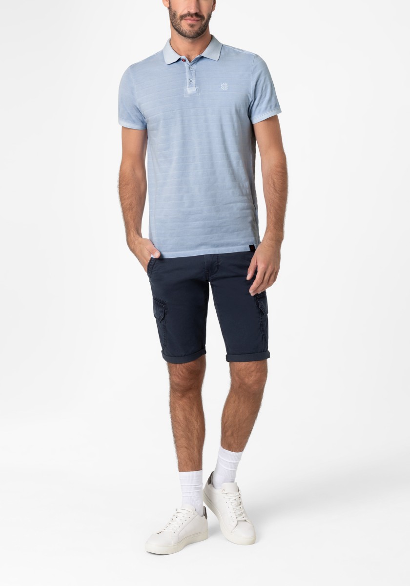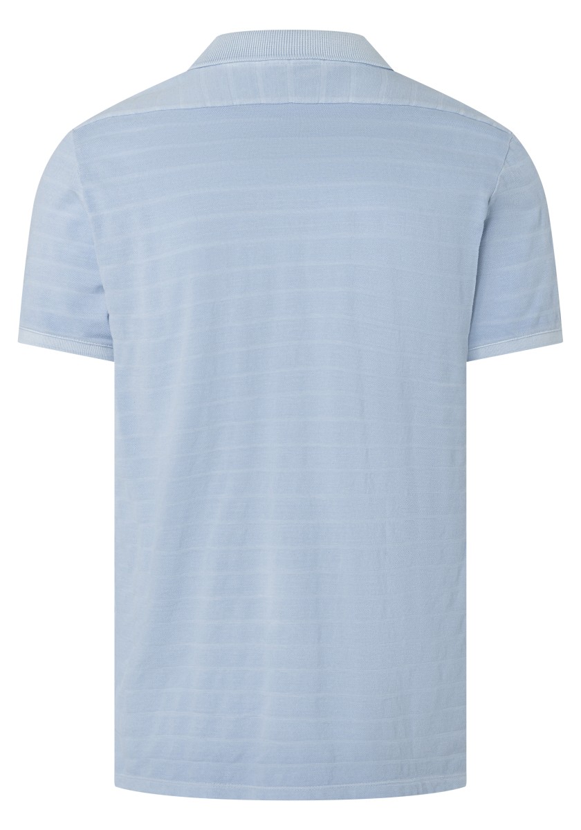 Polokošile s krátkým rukávem je kombinací polokošile a trička a je dodávána s charakteristickým plochým límcem. Pozornost je zde jednoznačně zaměřena na materiál. Zajímavý žakárový piqué žerzej má propracovaný, tónovaný pruhovaný vzor a ležérní barevné praní s efektem barviva na oděvy. Model s krátkou úzkou knoflíkovou légou, odpovídající výšivkou loga na hrudi, úzkým ramenním sedlem a ležérně rozparkovanými bočními švy.