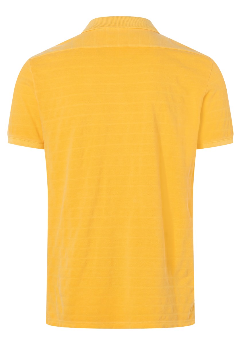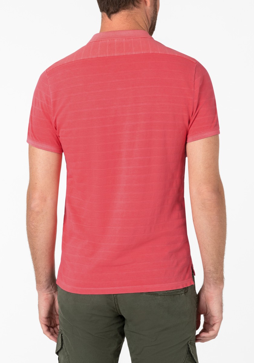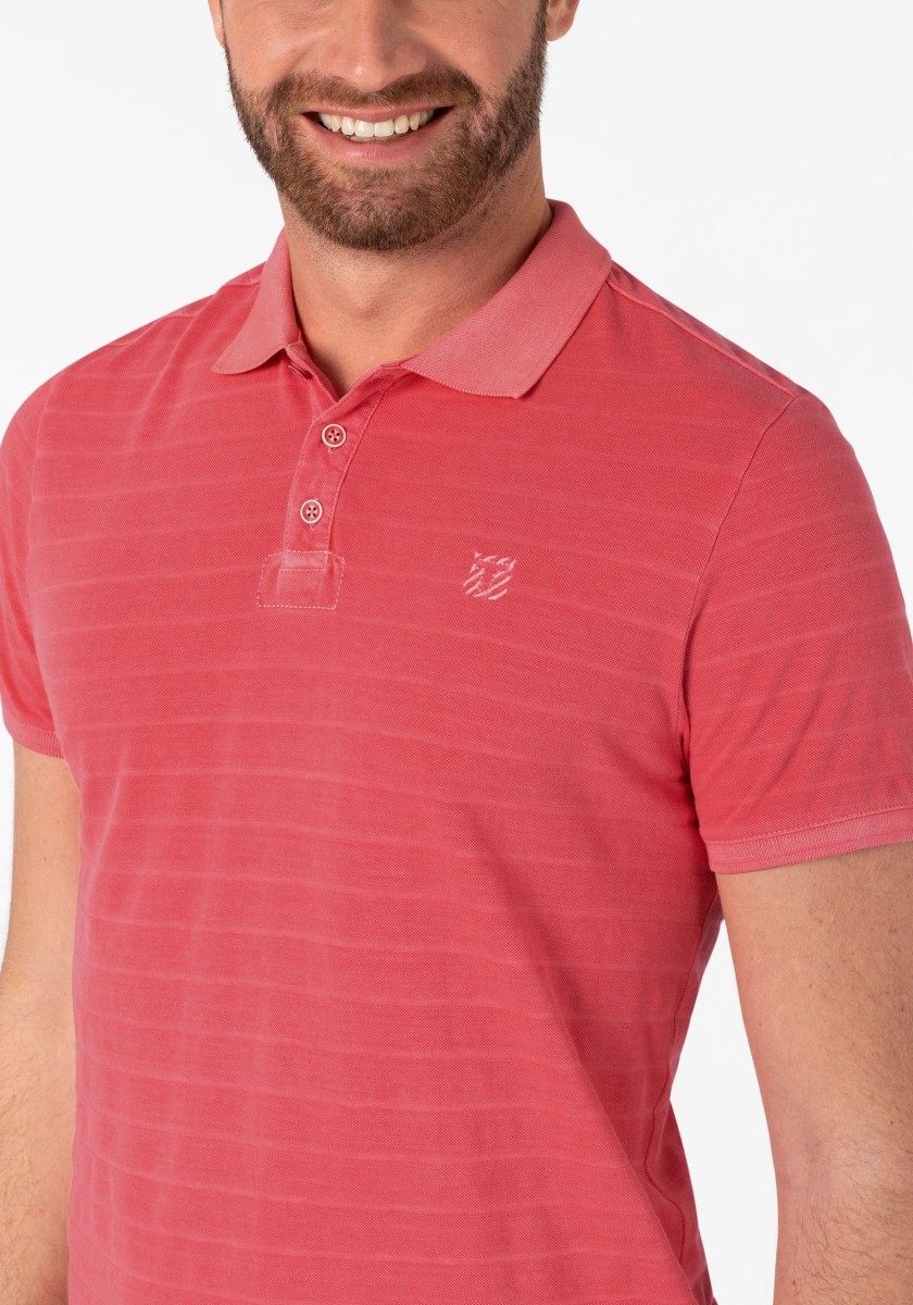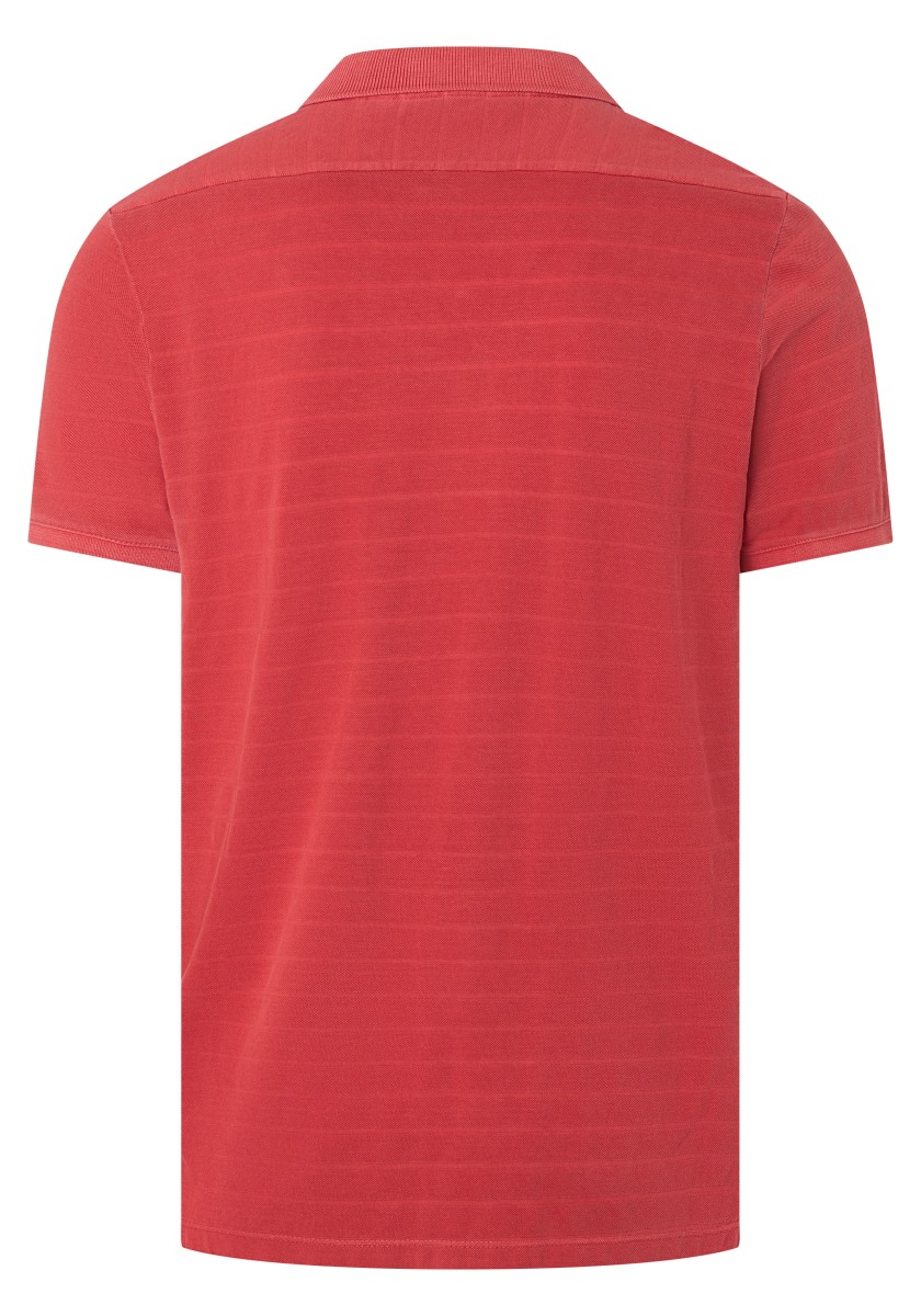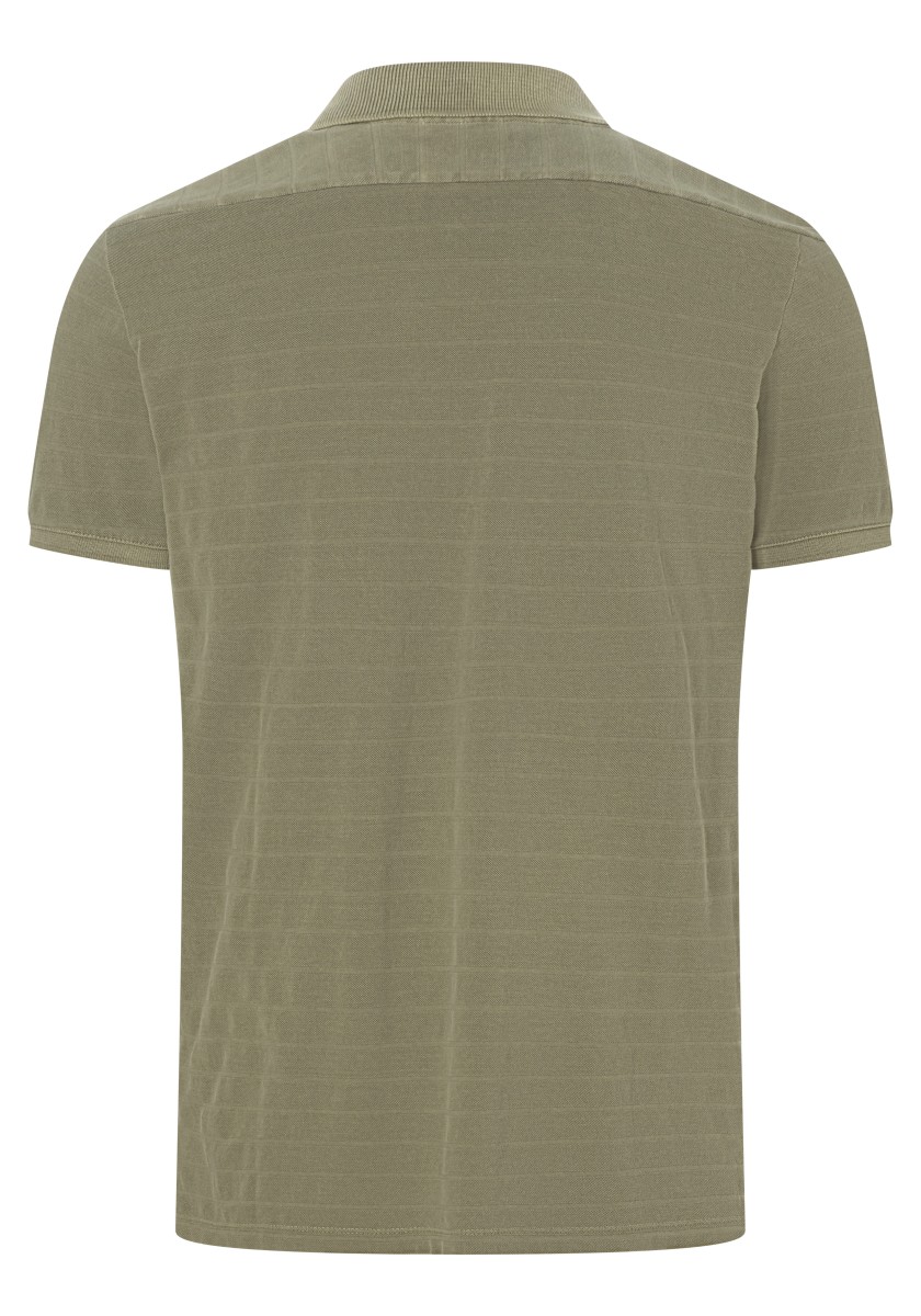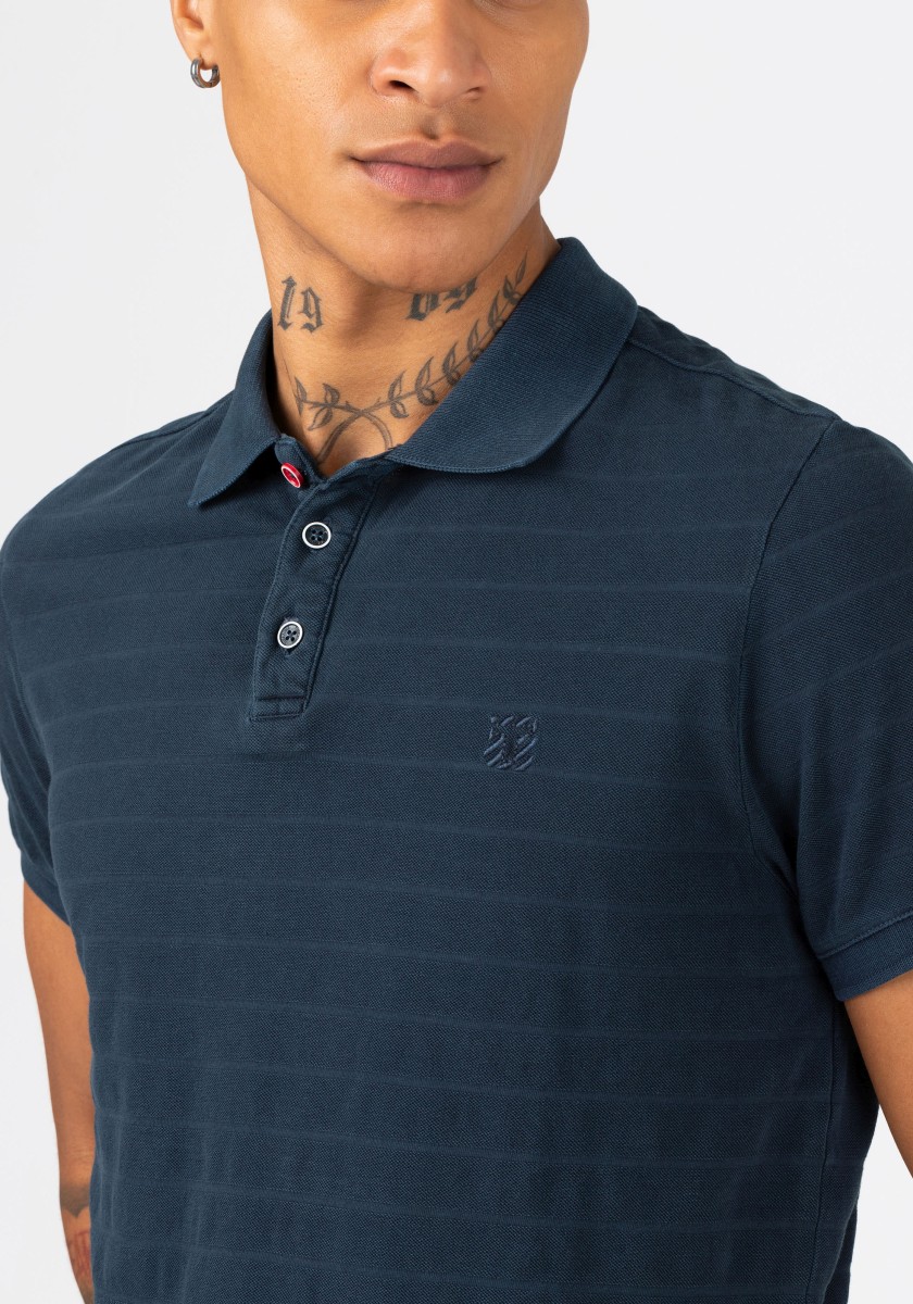 Polokošile s krátkým rukávem je kombinací polokošile a trička a je dodávána s charakteristickým plochým límcem. Pozornost je zde jednoznačně zaměřena na materiál. Zajímavý žakárový piqué žerzej má propracovaný, tónovaný pruhovaný vzor a ležérní barevné praní s efektem barviva na oděvy. Model s krátkou úzkou knoflíkovou légou, odpovídající výšivkou loga na hrudi, úzkým ramenním sedlem a ležérně rozparkovanými bočními švy.