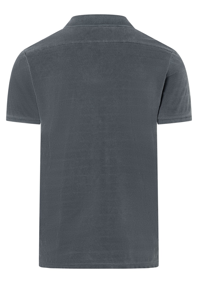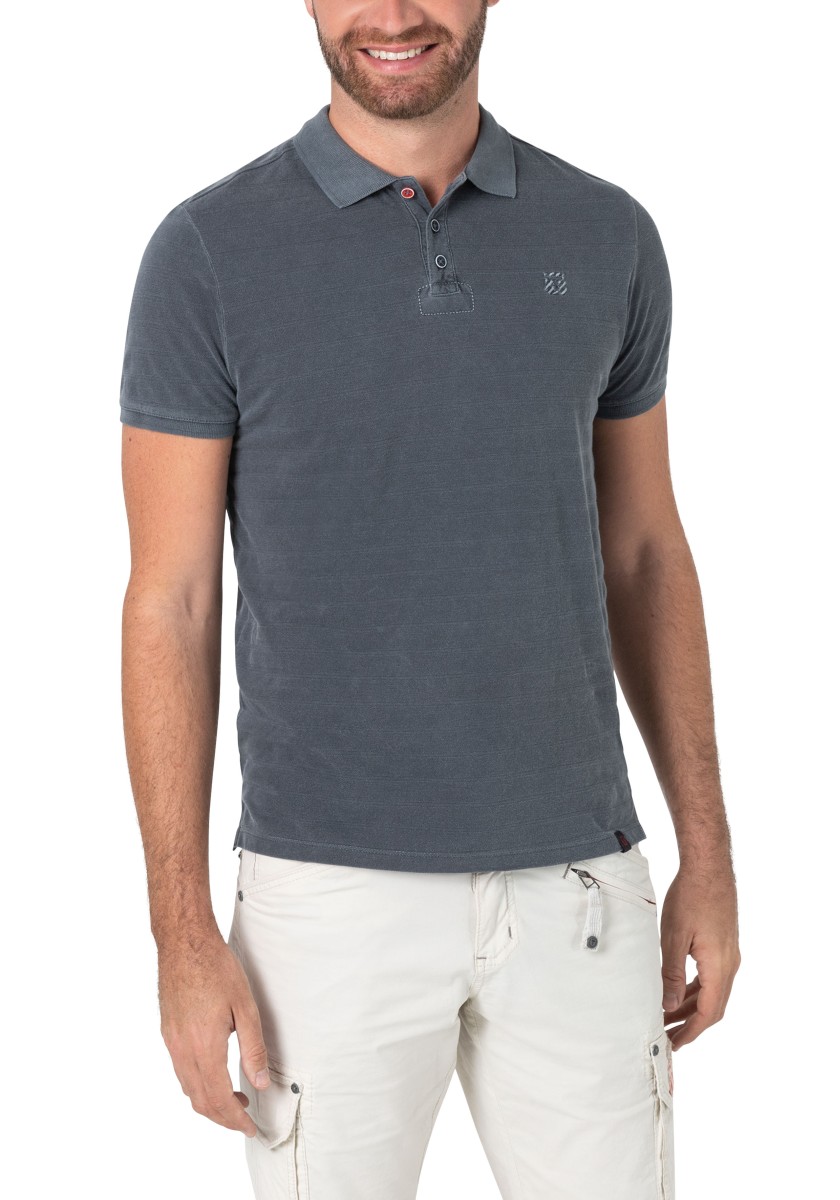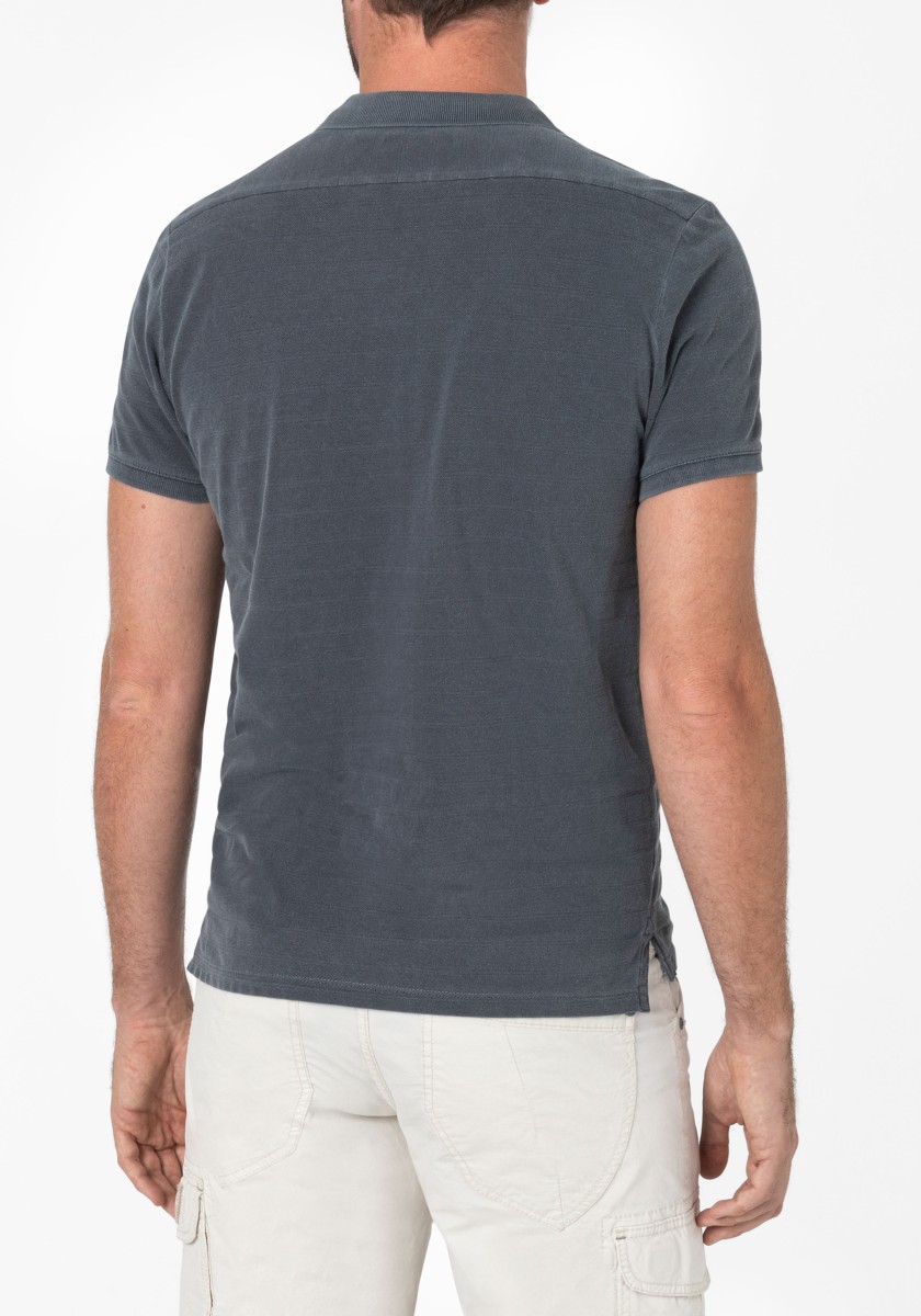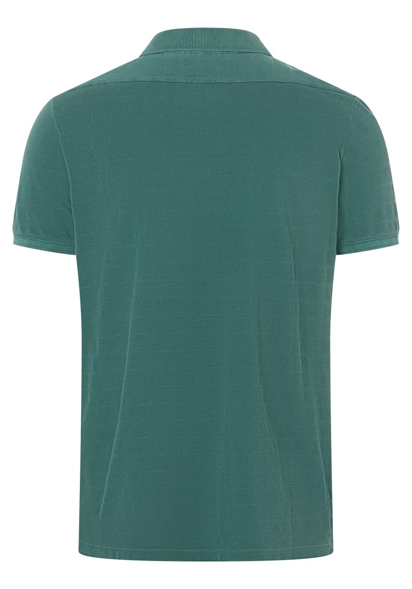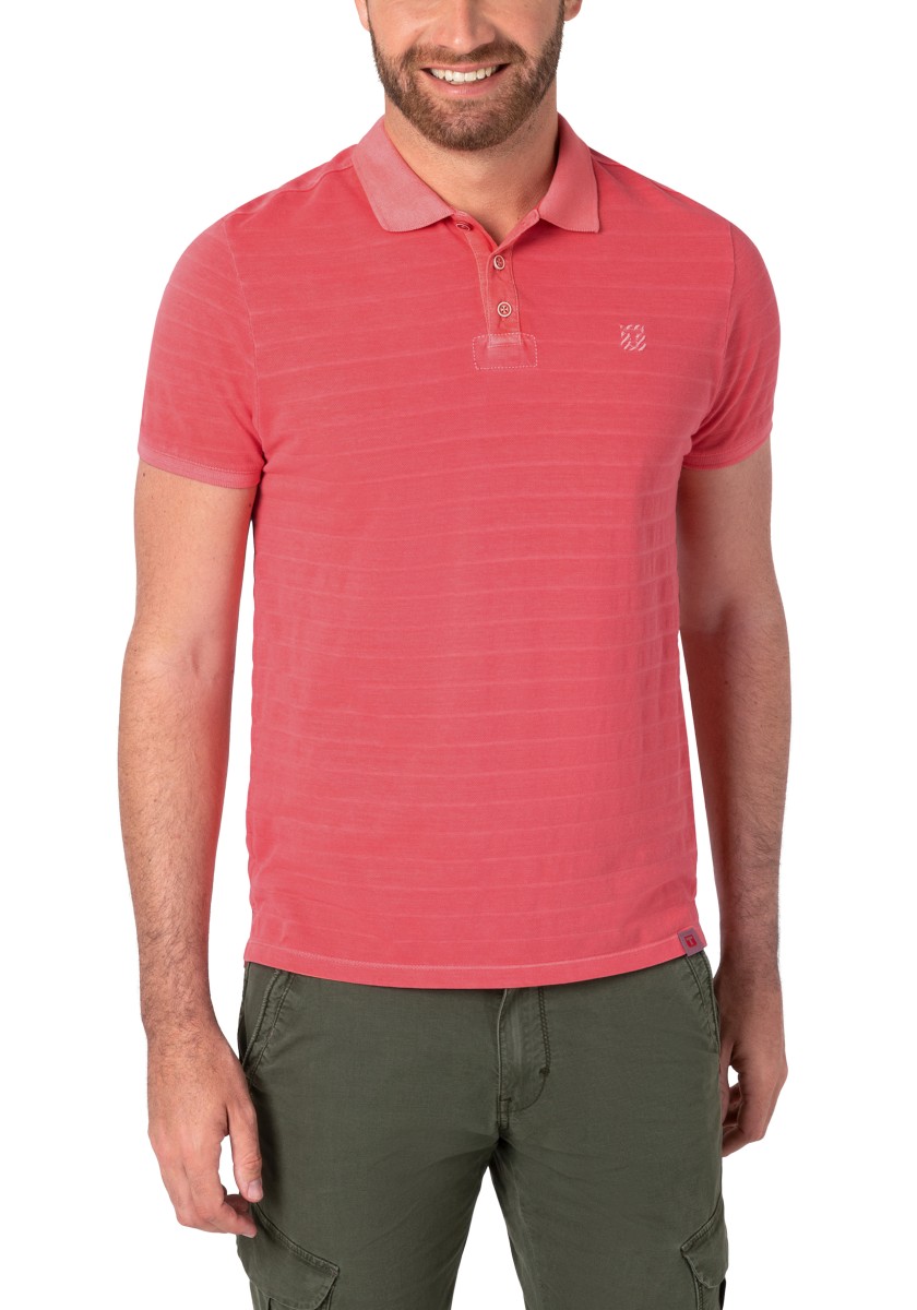 Polokošile s krátkým rukávem je kombinací polokošile a trička a je dodávána s charakteristickým plochým límcem. Pozornost je zde jednoznačně zaměřena na materiál. Zajímavý žakárový piqué žerzej má propracovaný, tónovaný pruhovaný vzor a ležérní barevné praní s efektem barviva na oděvy. Model s krátkou úzkou knoflíkovou légou, odpovídající výšivkou loga na hrudi, úzkým ramenním sedlem a ležérně rozparkovanými bočními švy.