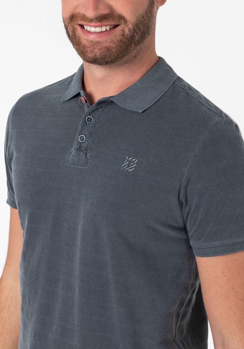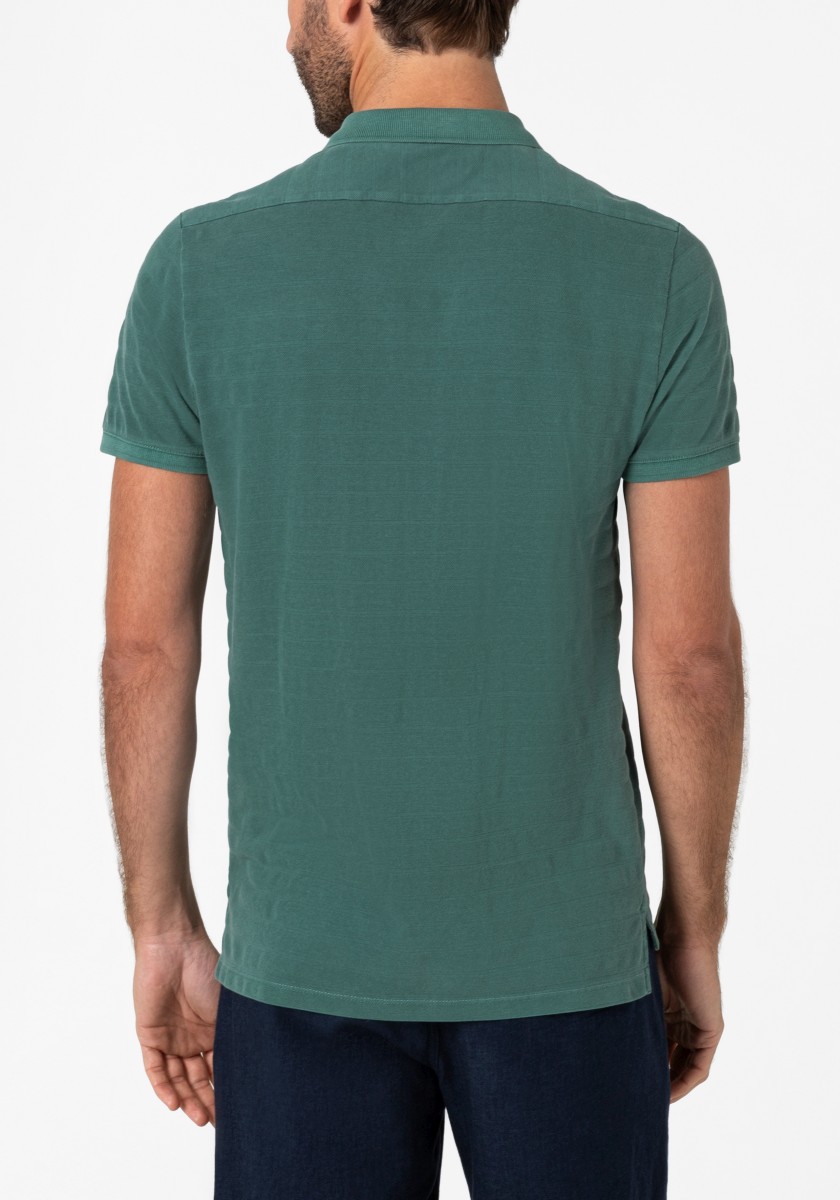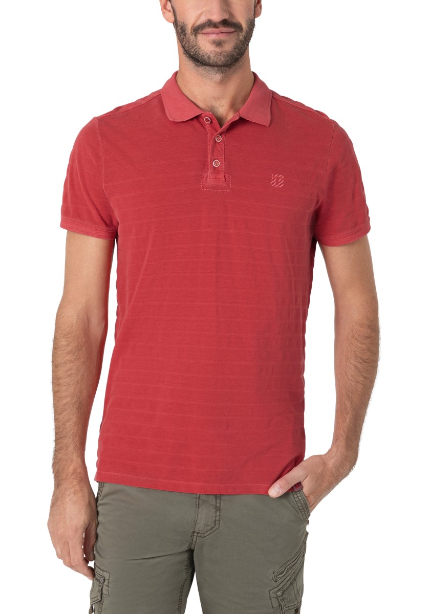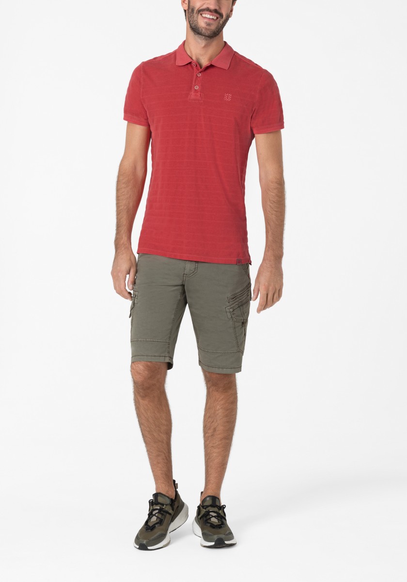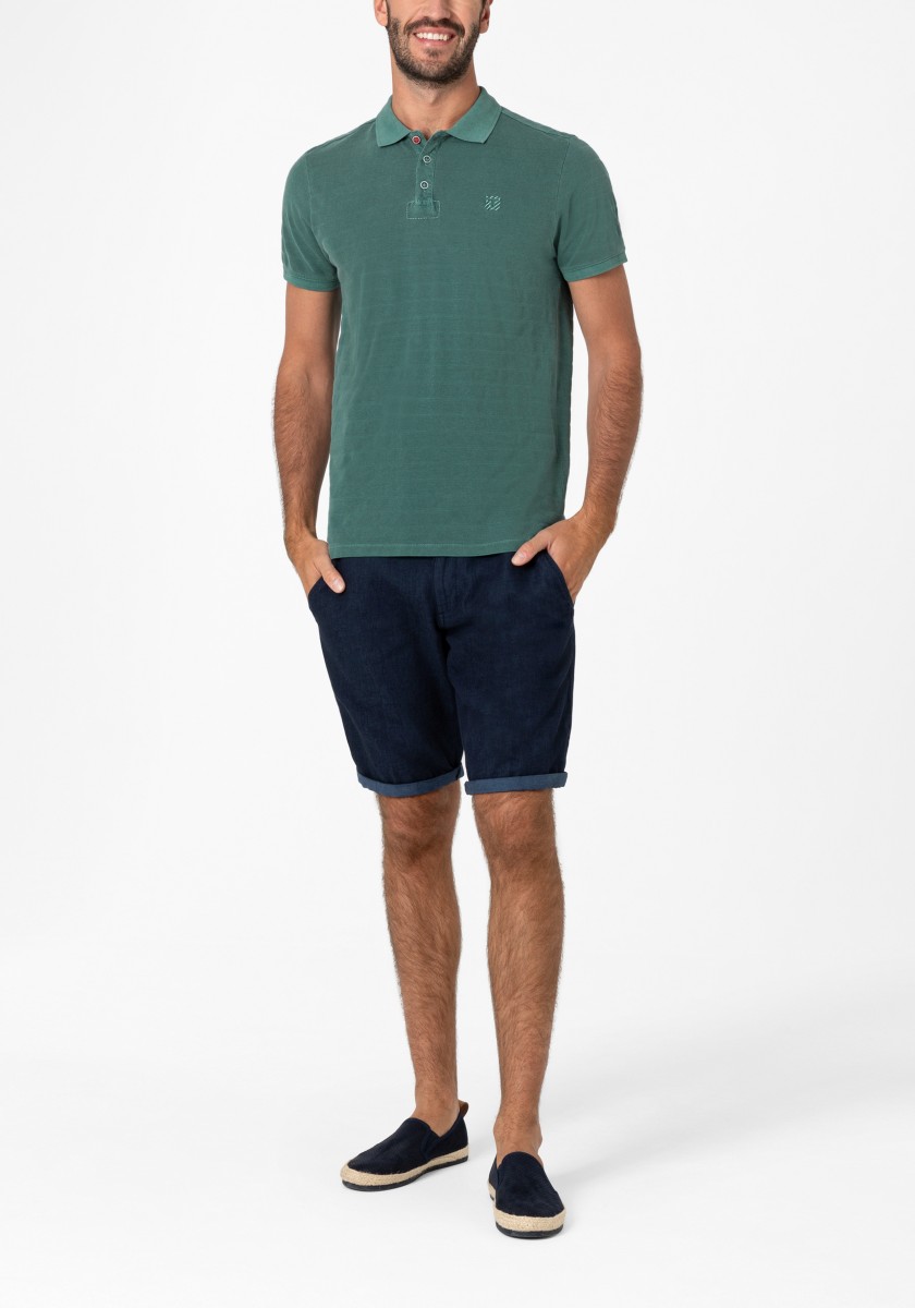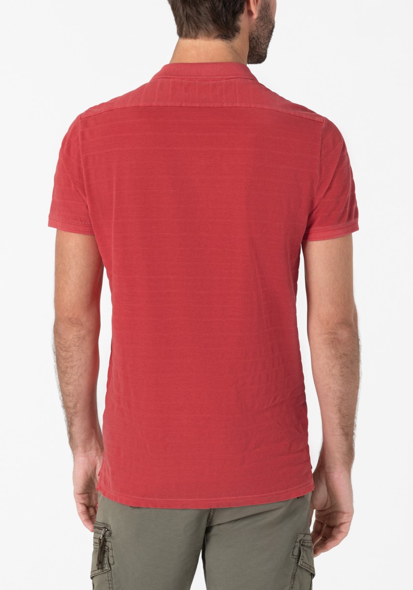 Polokošile s krátkým rukávem je kombinací polokošile a trička a je dodávána s charakteristickým plochým límcem. Pozornost je zde jednoznačně zaměřena na materiál. Zajímavý žakárový piqué žerzej má propracovaný, tónovaný pruhovaný vzor a ležérní barevné praní s efektem barviva na oděvy. Model s krátkou úzkou knoflíkovou légou, odpovídající výšivkou loga na hrudi, úzkým ramenním sedlem a ležérně rozparkovanými bočními švy.