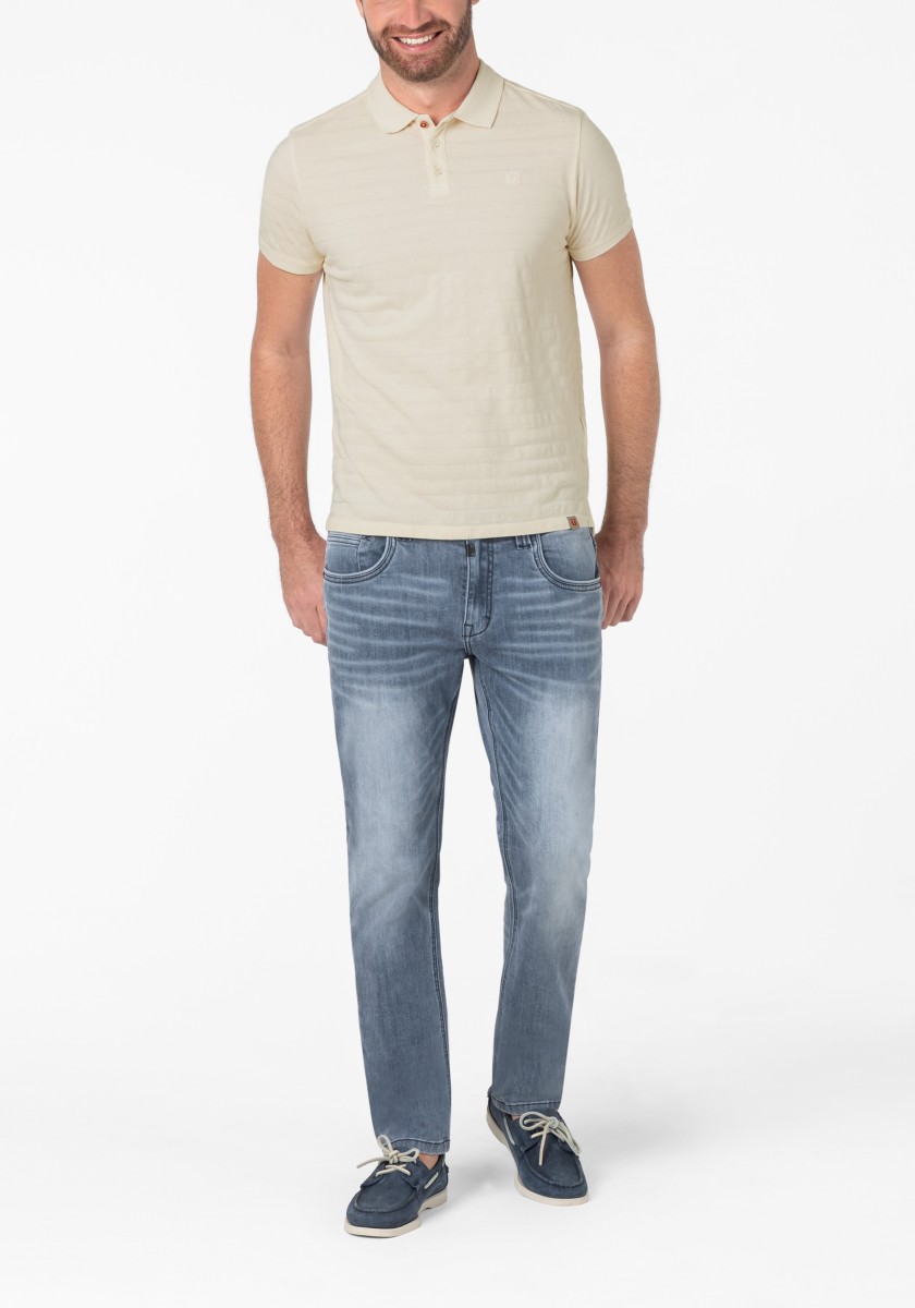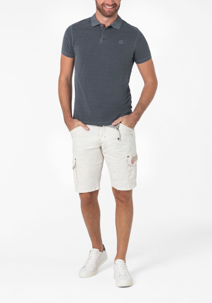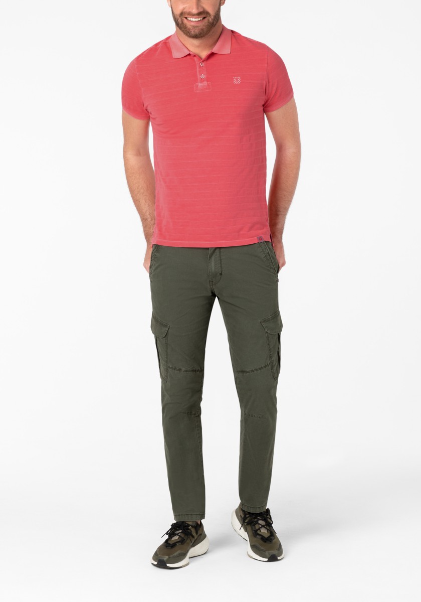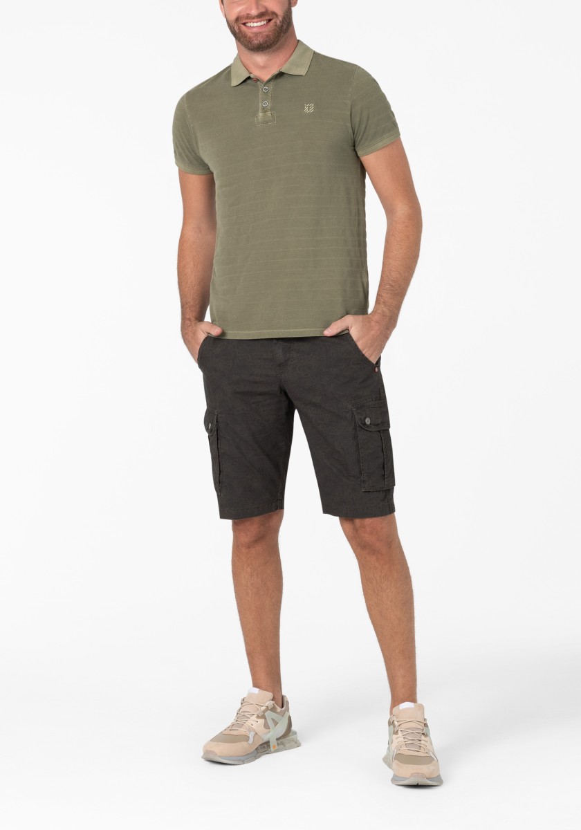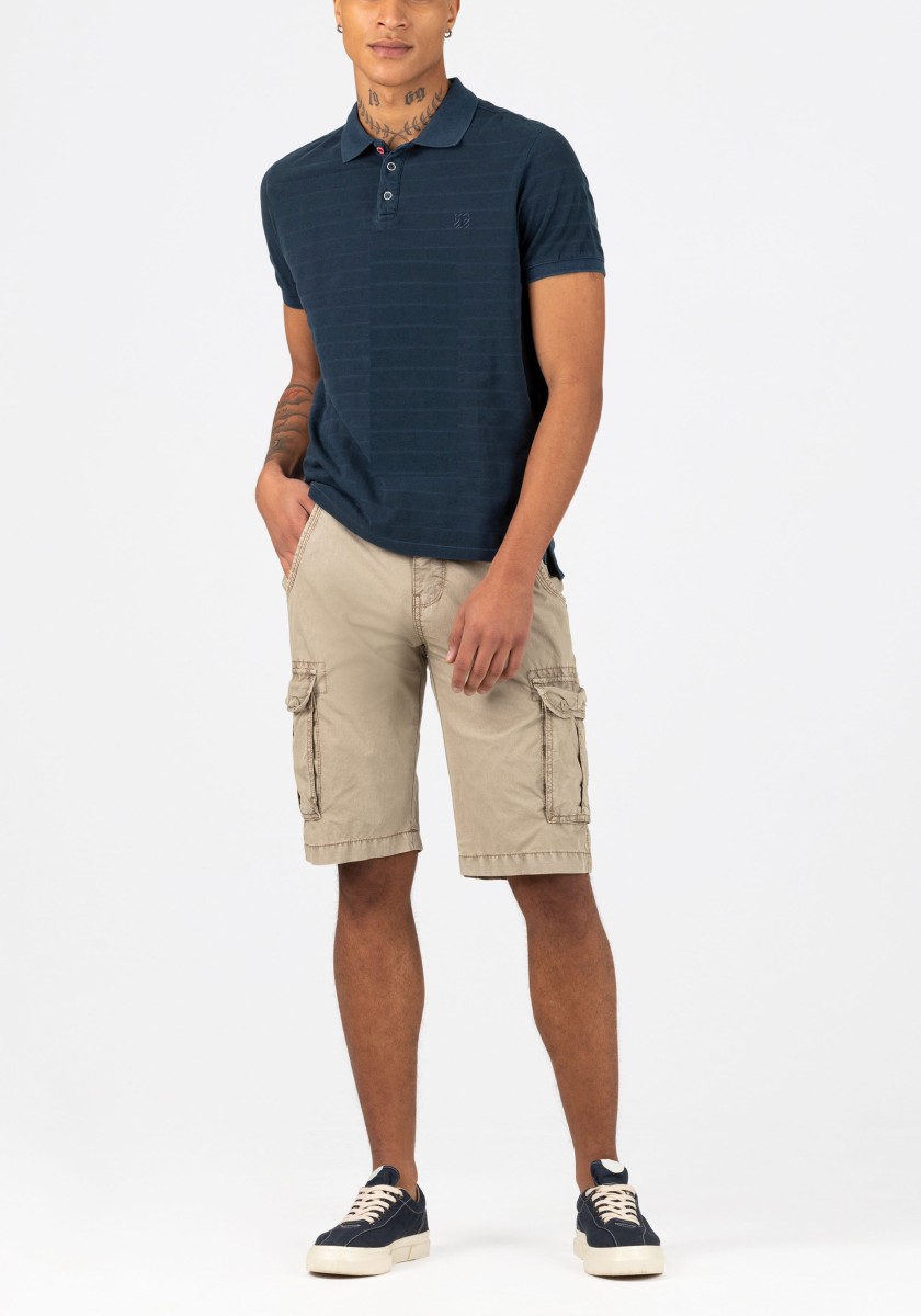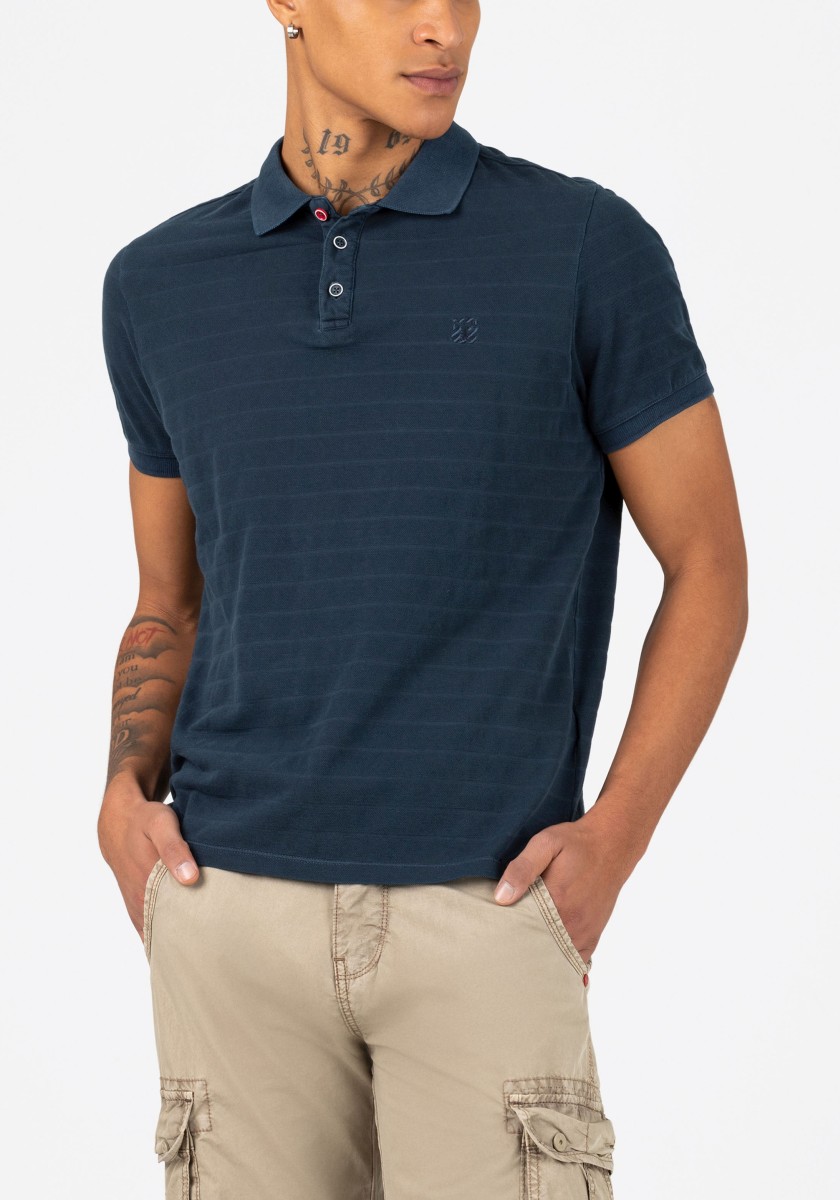 Polokošile s krátkým rukávem je kombinací polokošile a trička a je dodávána s charakteristickým plochým límcem. Pozornost je zde jednoznačně zaměřena na materiál. Zajímavý žakárový piqué žerzej má propracovaný, tónovaný pruhovaný vzor a ležérní barevné praní s efektem barviva na oděvy. Model s krátkou úzkou knoflíkovou légou, odpovídající výšivkou loga na hrudi, úzkým ramenním sedlem a ležérně rozparkovanými bočními švy.