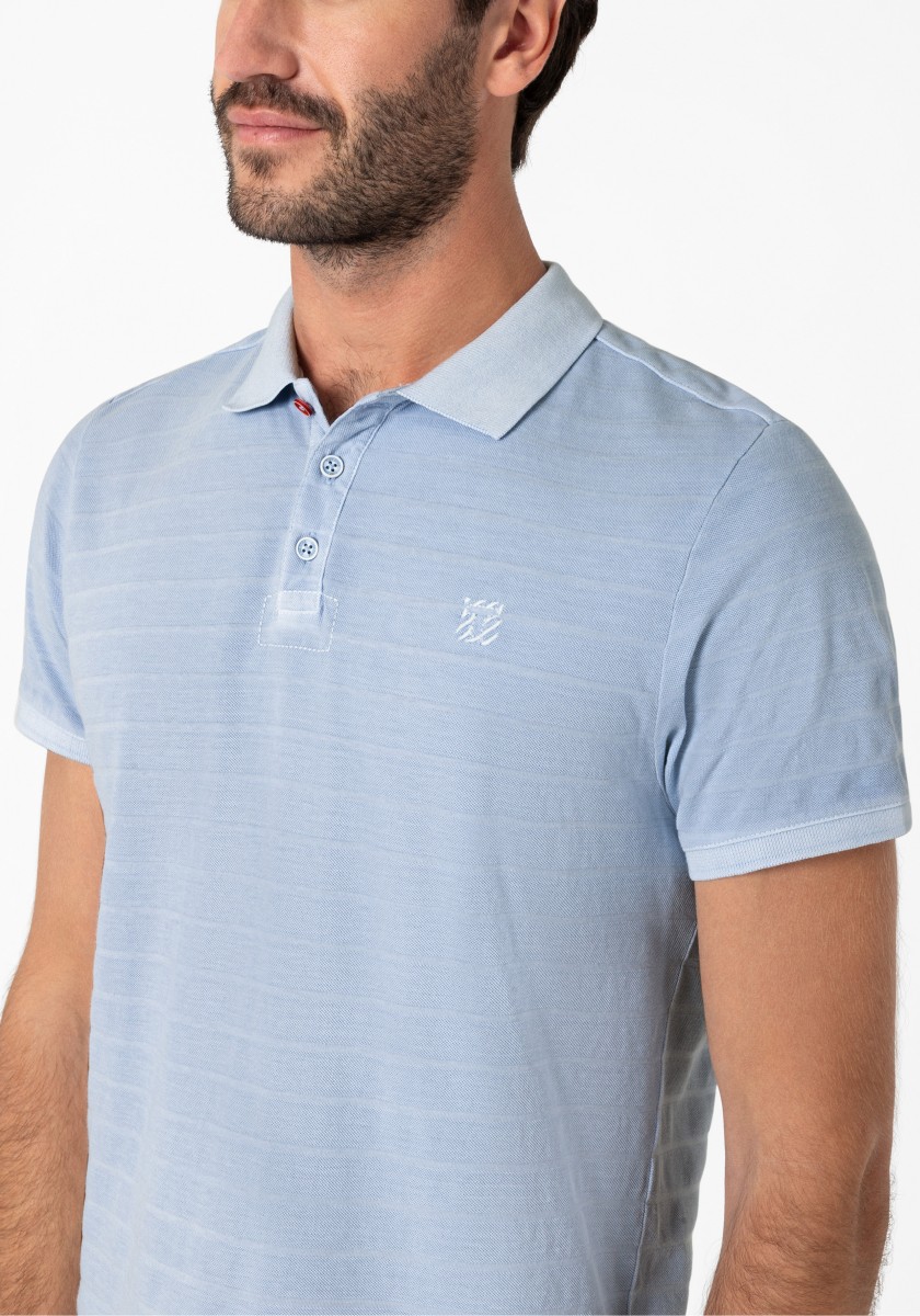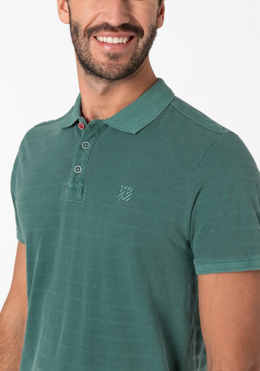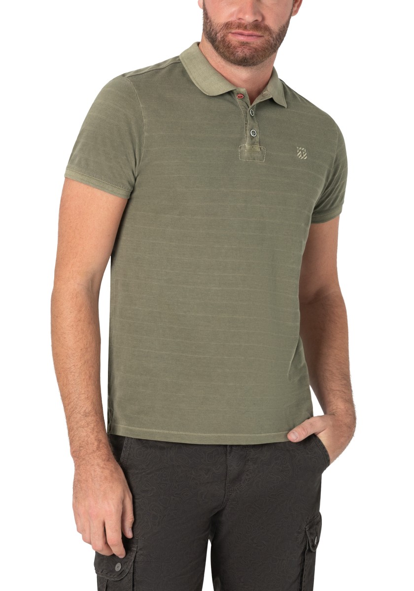 Short -sleeved polo shirts are a combination of polo shirts and t -shirts and comes with a characteristic flat collar. Attention is clearly focused on the material. An interesting jacquard piqué jersej has a sophisticated, tinted striped pattern and casual color washing with the effect of dye on clothing. A model with a short narrow button fly, corresponding to the embroidery logo on the chest, a narrow shoulder saddle and casually parked side seams.