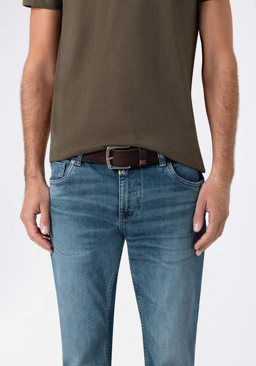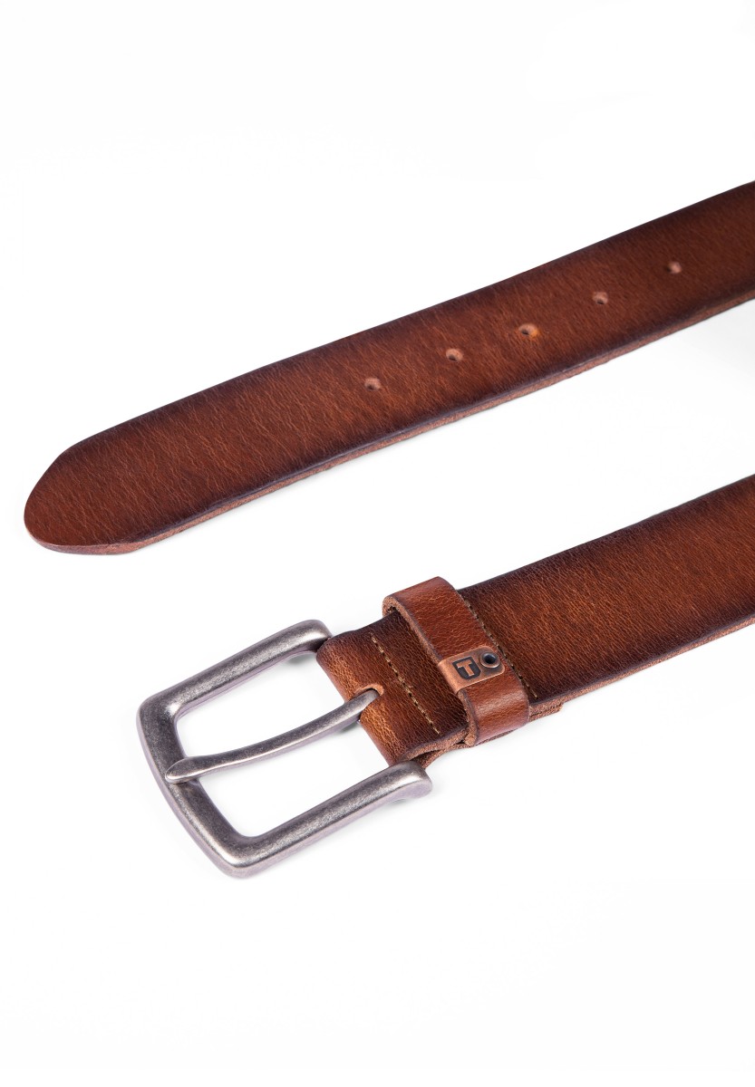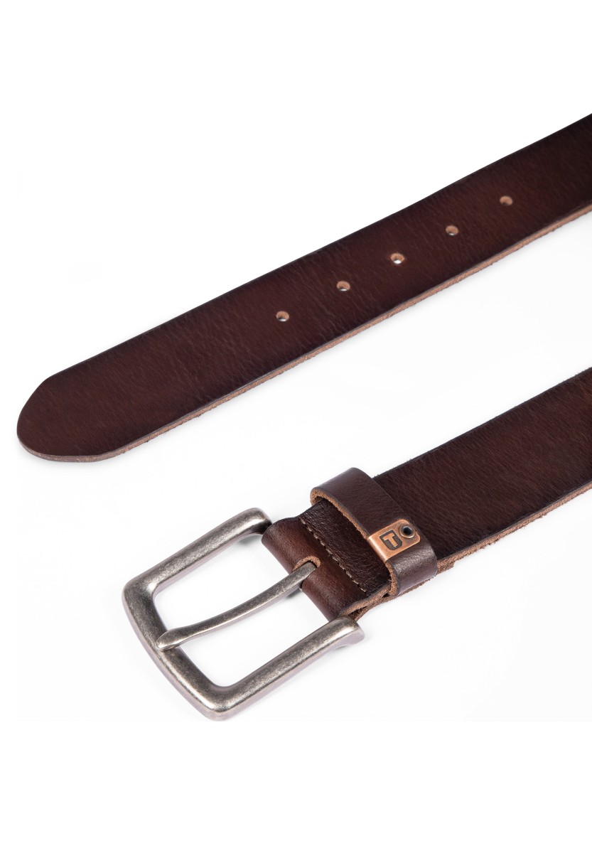 Robust leather belt in classic simple design with vintage in touch. The belt is made of genuine cowhide and has typical fine unevenness. However, these are characteristic of the skin as a true natural product. With a square clip of cut metal and a small metal logo.