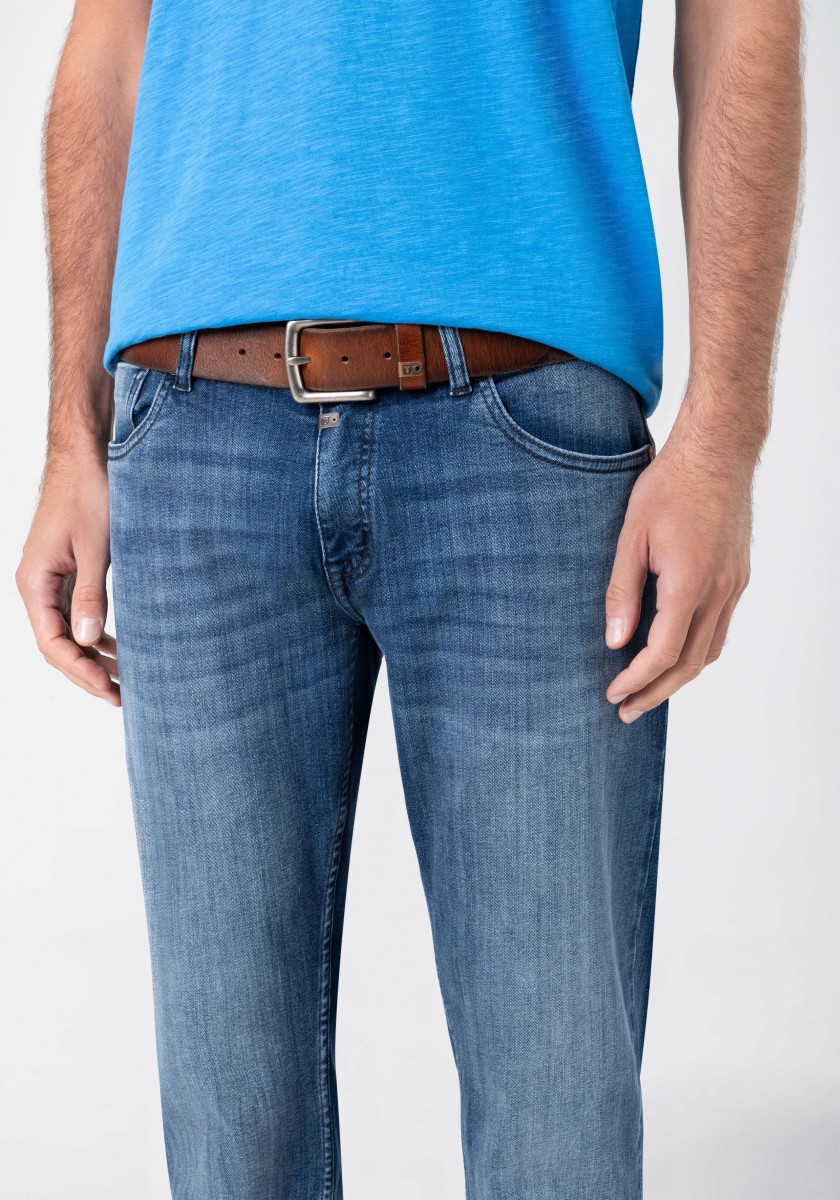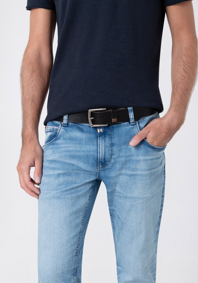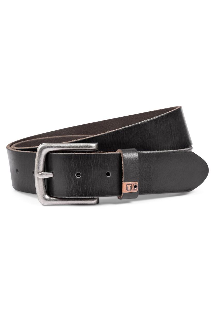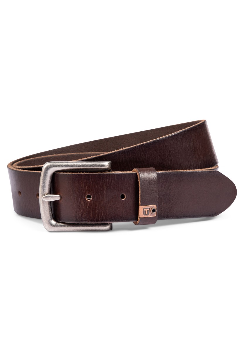 Robust leather belt in classic simple design with vintage in touch. The belt is made of genuine cowhide and has typical fine unevenness. However, these are characteristic of the skin as a true natural product. With a square clip of cut metal and a small metal logo.
